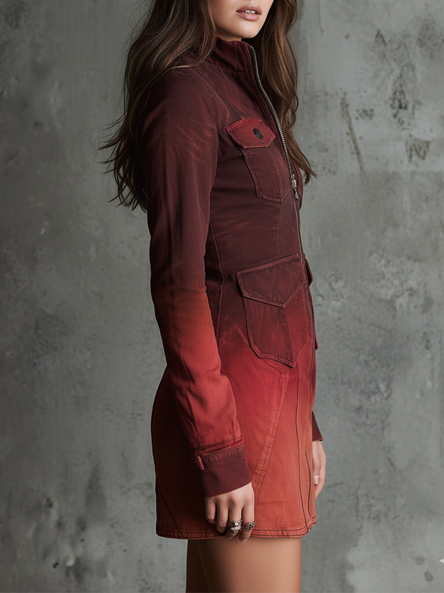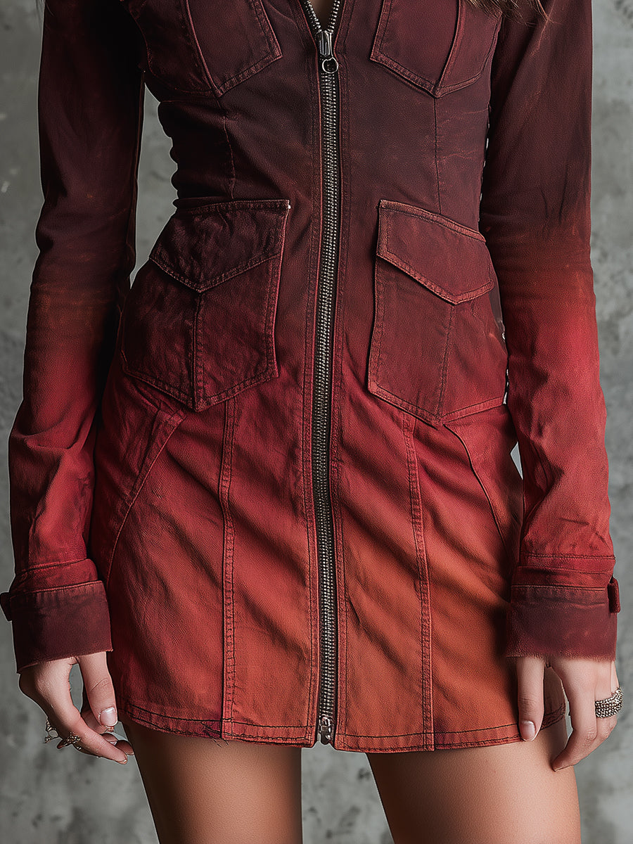 Bohemian Washed Gradient Denim Flap Pocket Slim Mini Dress