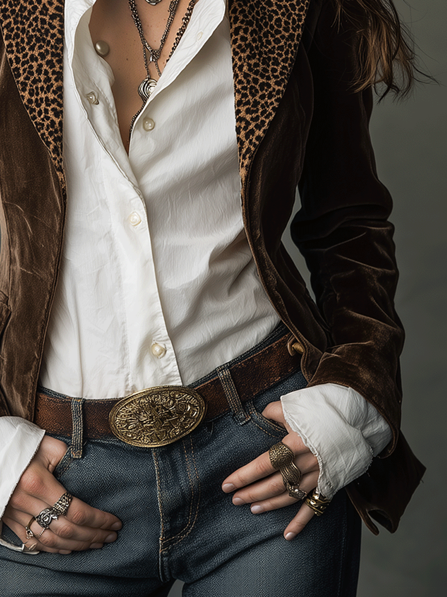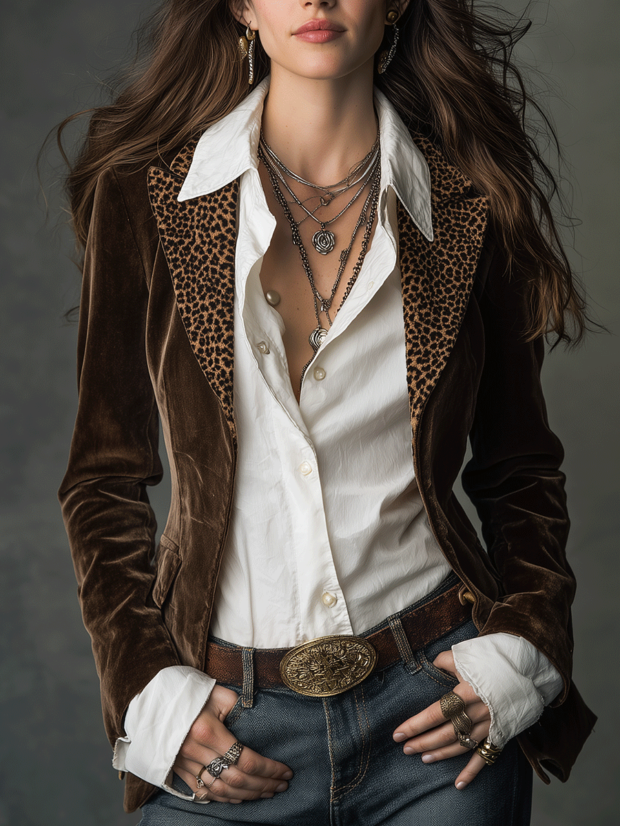 Boho Chocolate Velvet Leopard Lapel Blazer