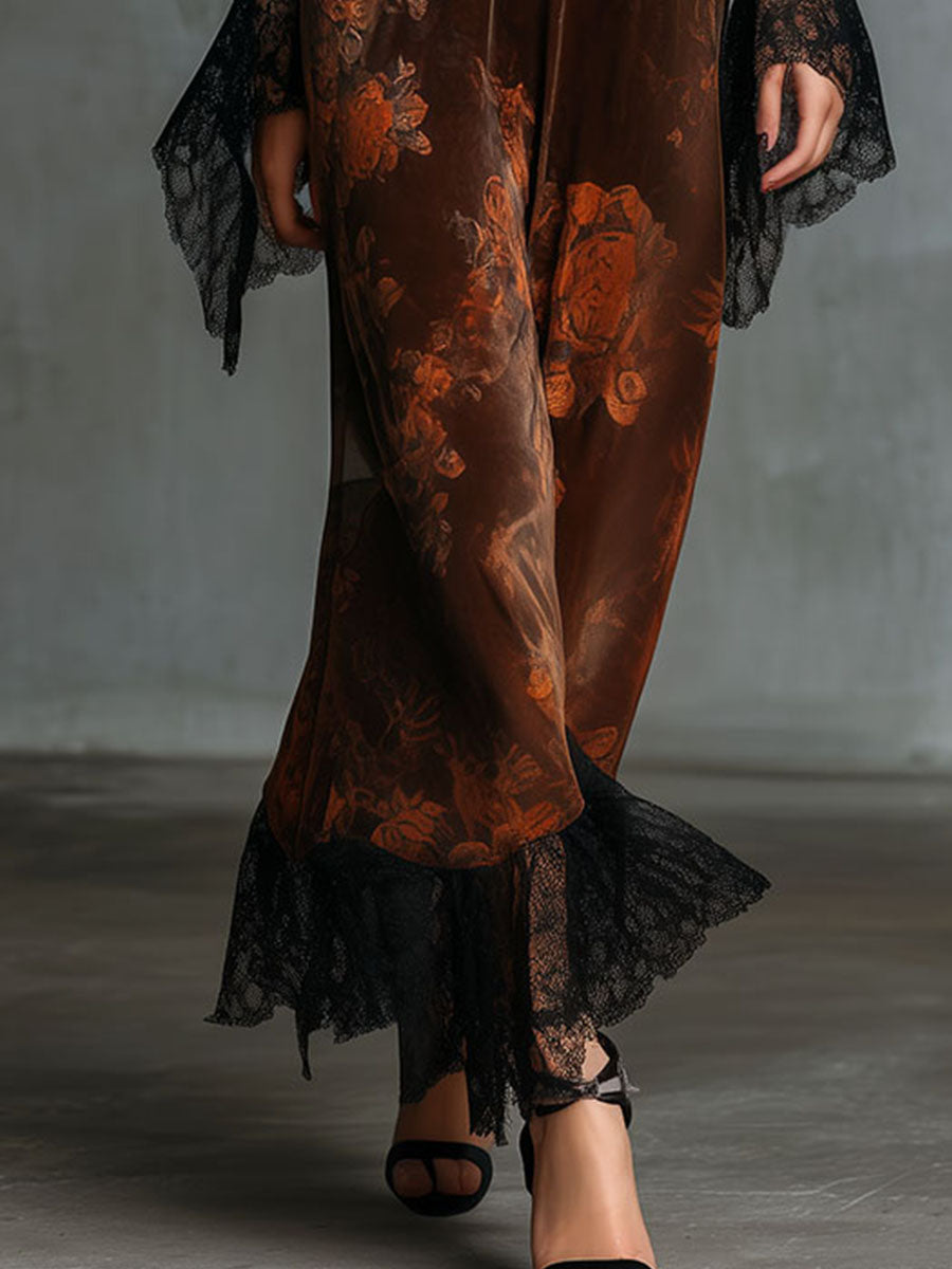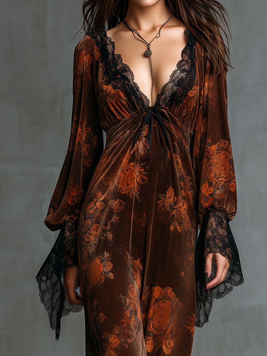 Boho Deep V Neck Floral Print Velvet Gown Dress With Lace Trim