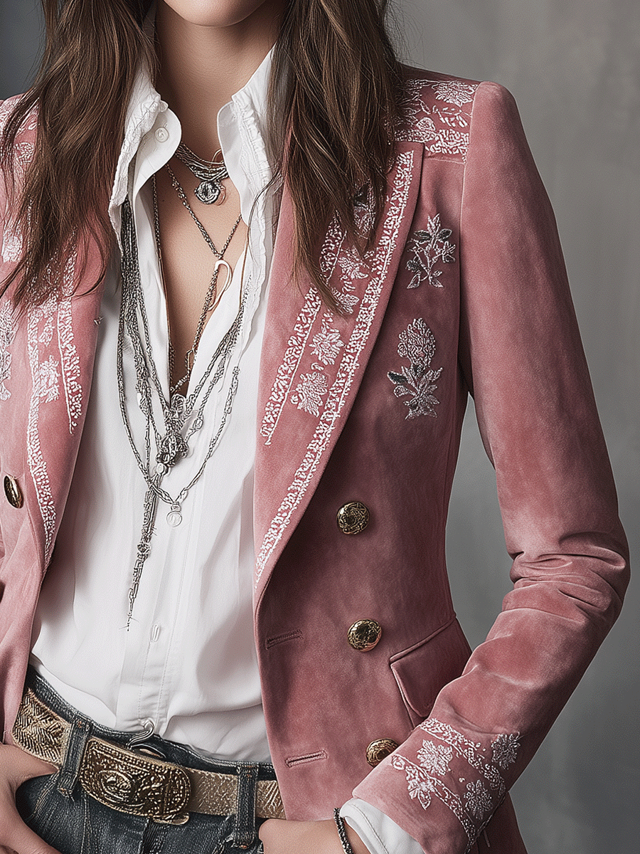 Pair the Boho Luxe Pink Velvet Tailored Blazer with a simple white blouse and high-waisted trousers for an effortlessly chic office look. For evening outings or special occasions, layer it over a classic black dress and accessorize with gold jewelry to enhance its bohemian charm.