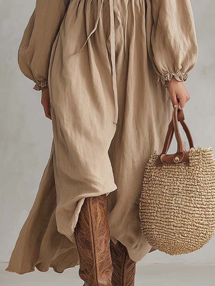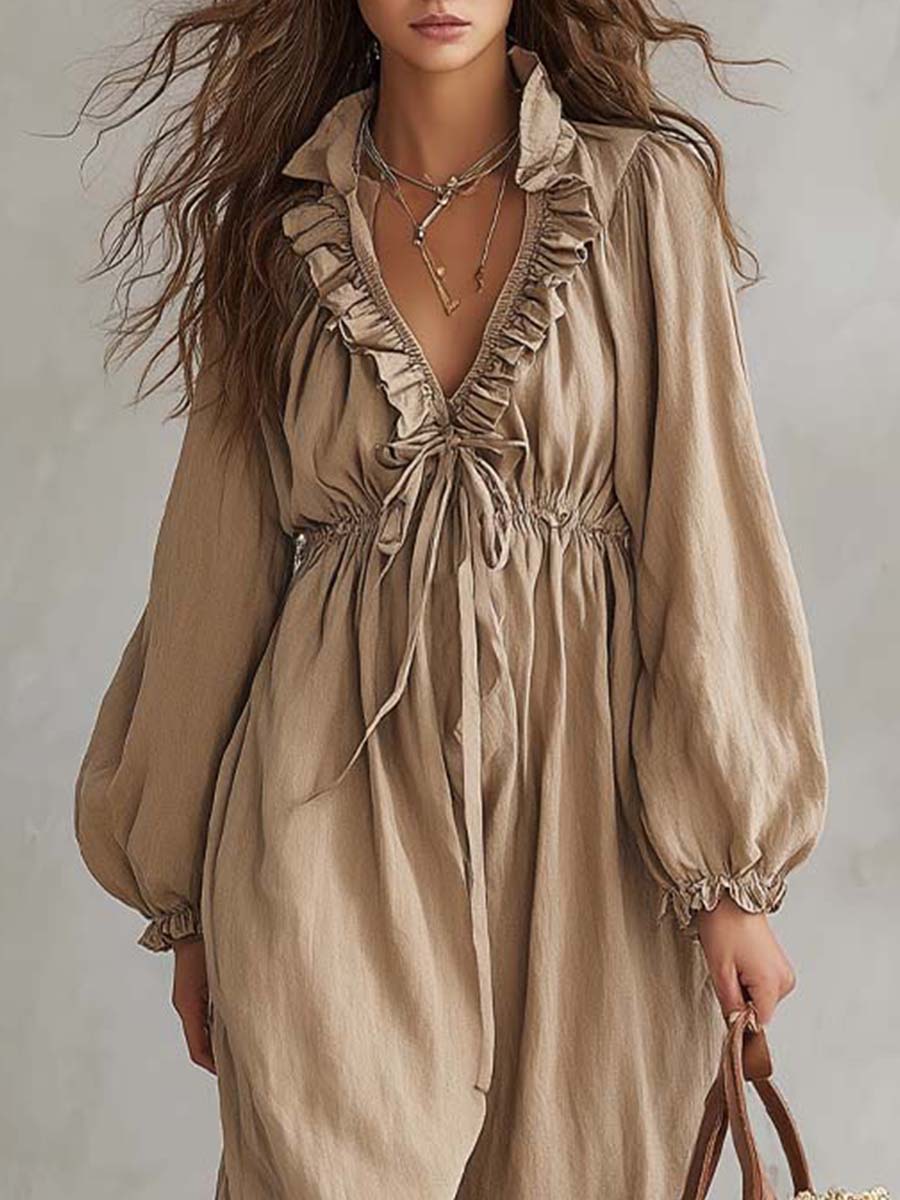 A relaxed yet refined boho maxi dress designed with effortless movement and soft romantic texture. The lightweight crinkle-woven fabric drapes fluidly, while the ruffled V-neckline and adjustable tie-front create a naturally feminine shape. The gathered waist provides gentle definition without restricting comfort, and the voluminous sleeves add soft drama. Finished with a flowing hem that moves beautifully with each step, this dress captures an elevated rustic charm—perfect for warm seasons, travel days, or outdoor gatherings.