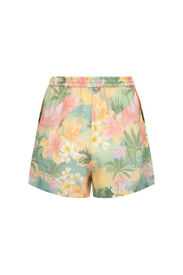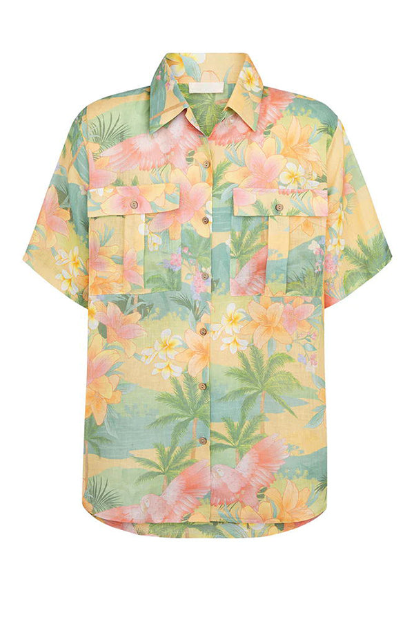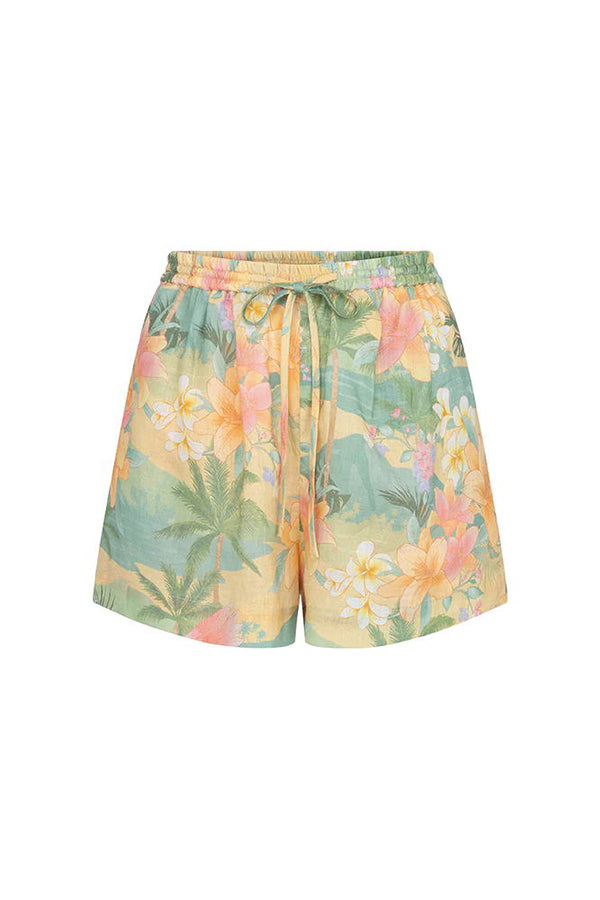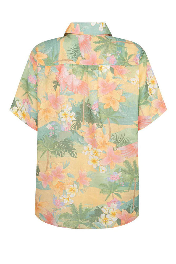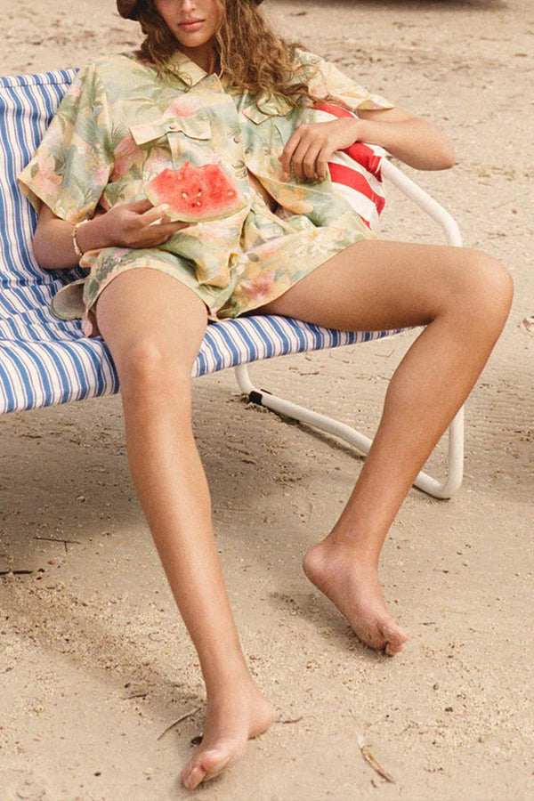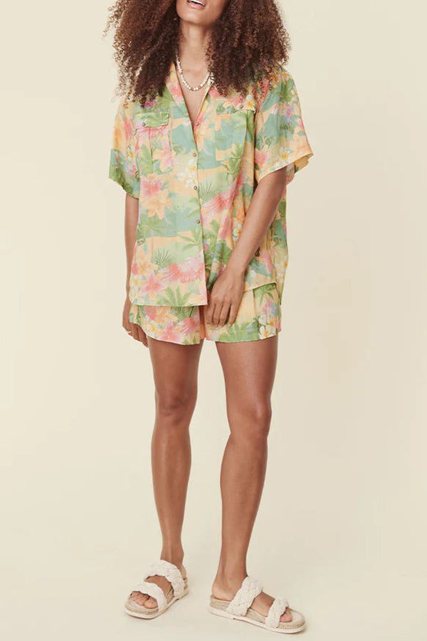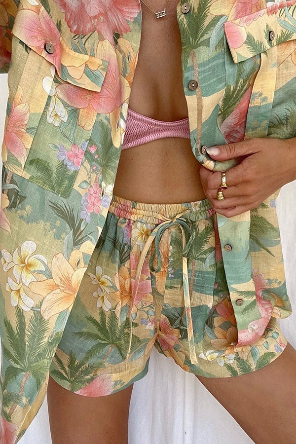 Breeze Hawaii Linen Blend Tropical Plants Printed Blouse and Elastic Waist Pocketed Shorts Set