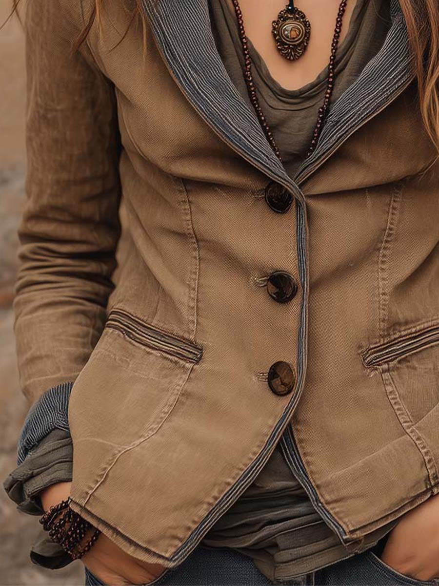Camel Washed Denim Slim-Fit Blazer With Contrast Trim