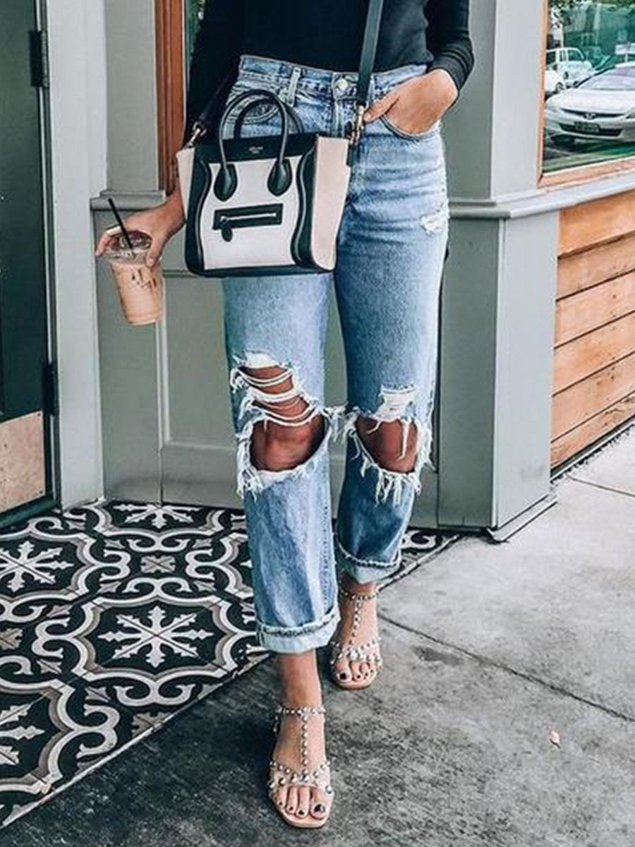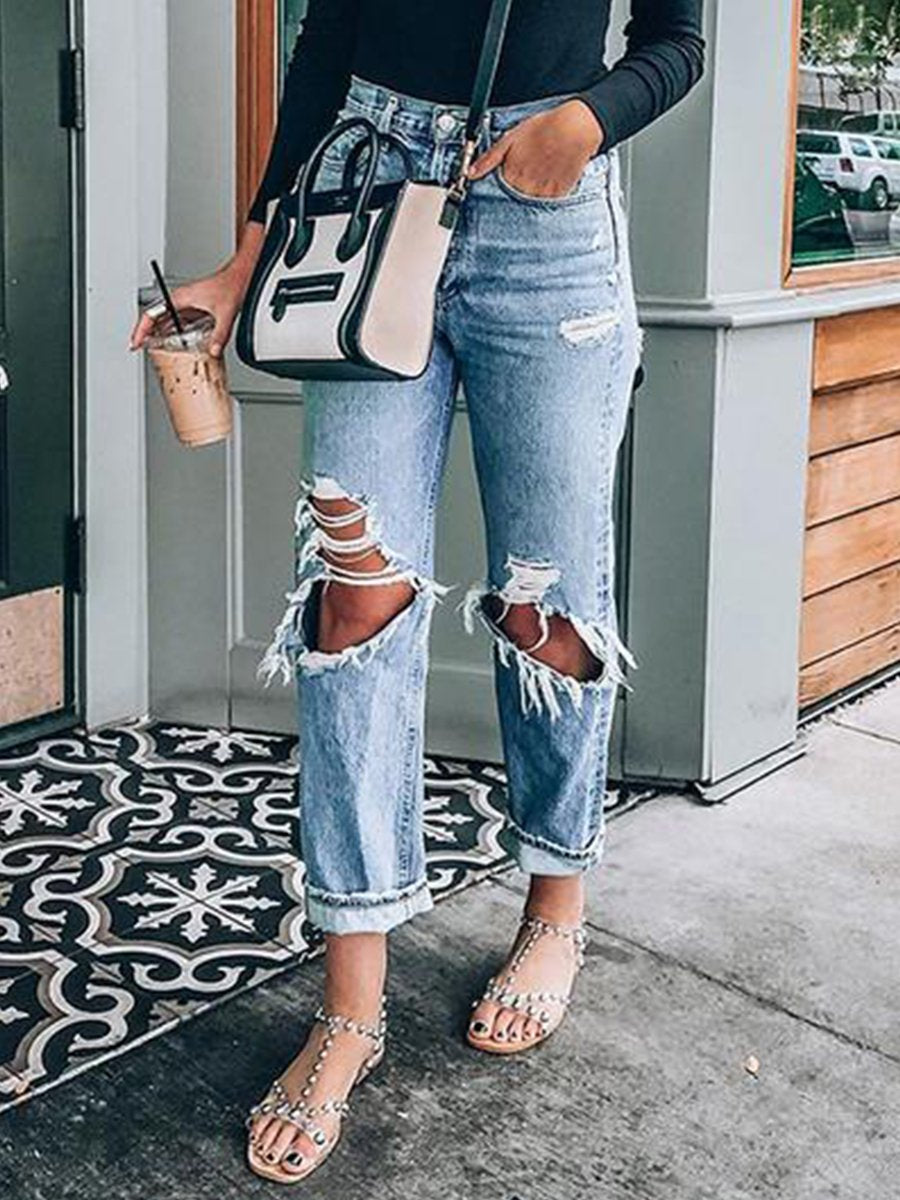 Casual Distressed Ripped Hole Mid-rise Straight Jeans
