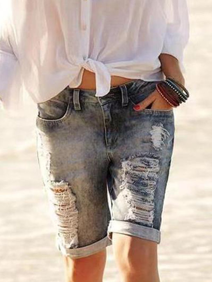 Casual Mid-rise Ripped Distressed Denim Bike Shorts