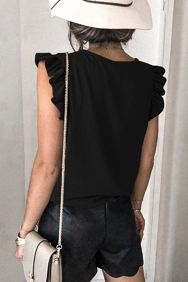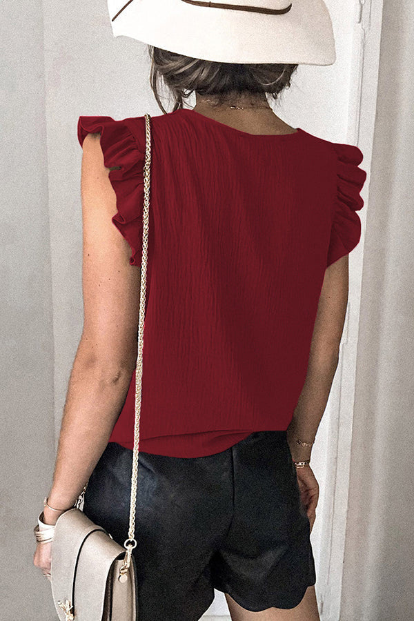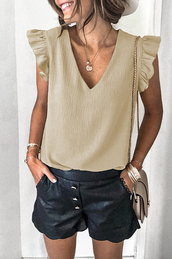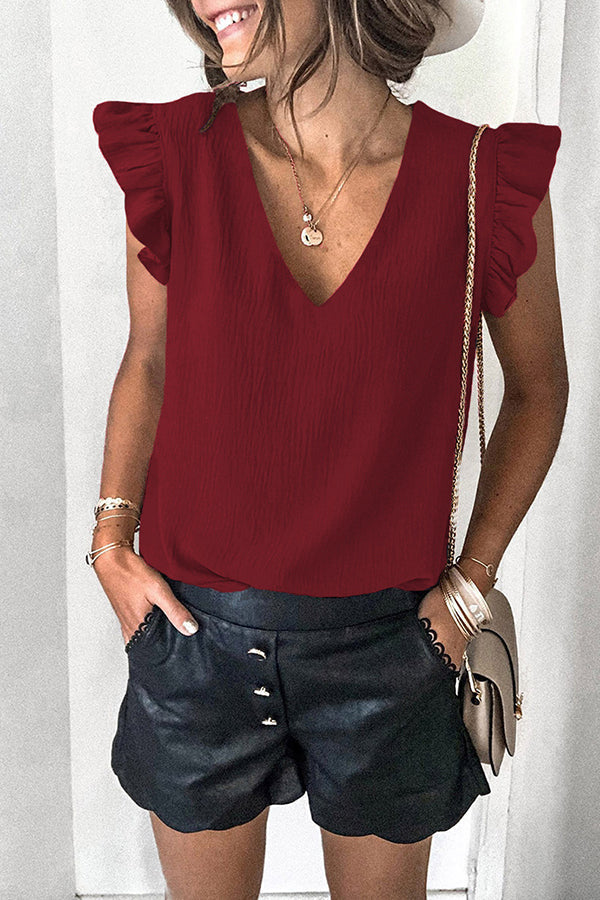 Casual T-shirt Solid V-neck Pullover Ruffle Sleeve Top