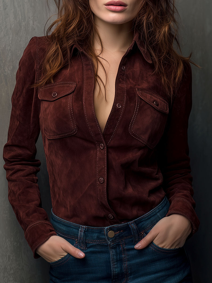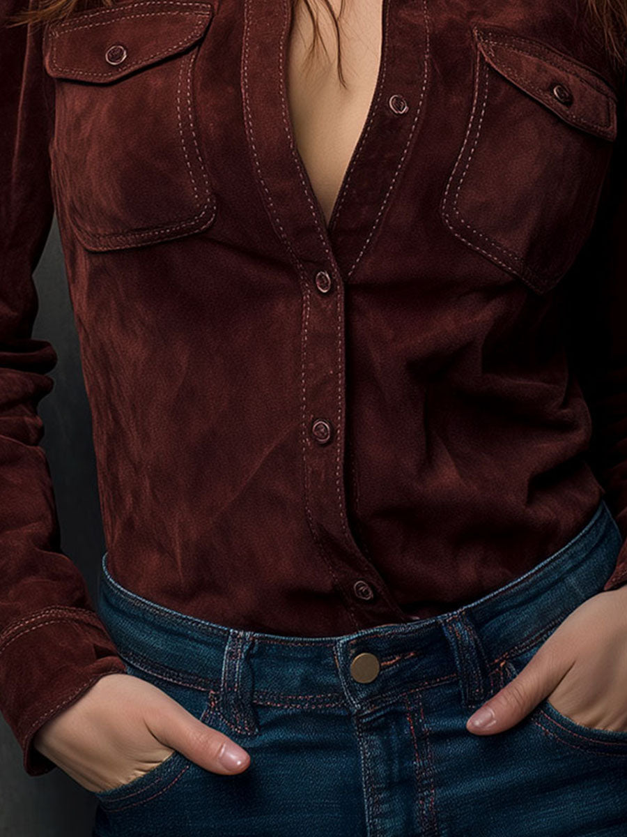 Chestnut Brown Eco Suede Western Shirt With Pockets
