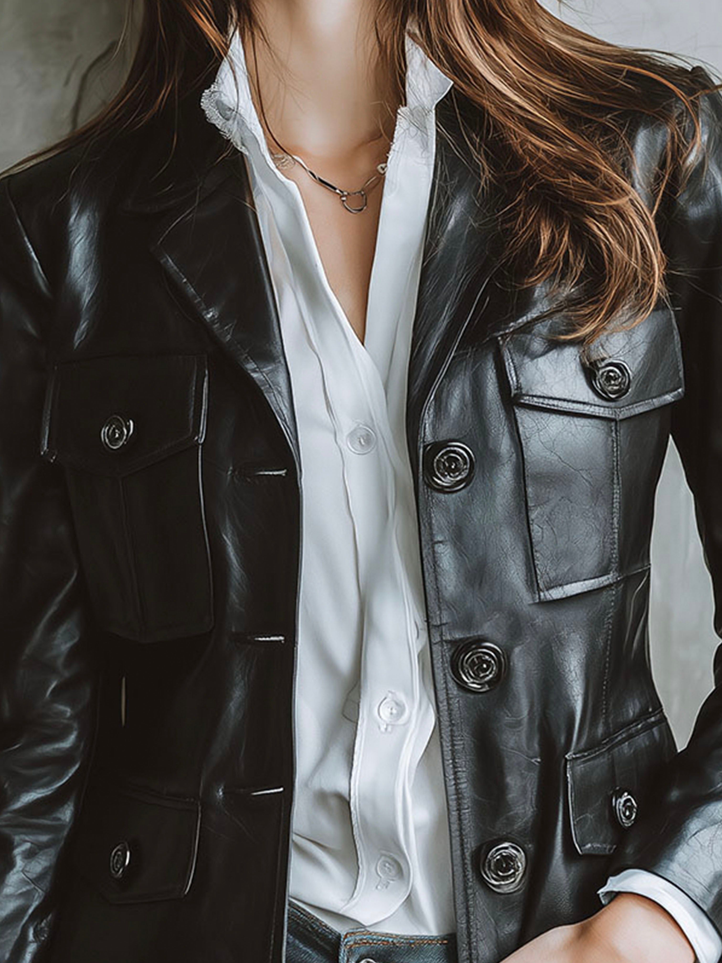 Chic Black Eco Leather Tailored Blazer With Flap Pockets