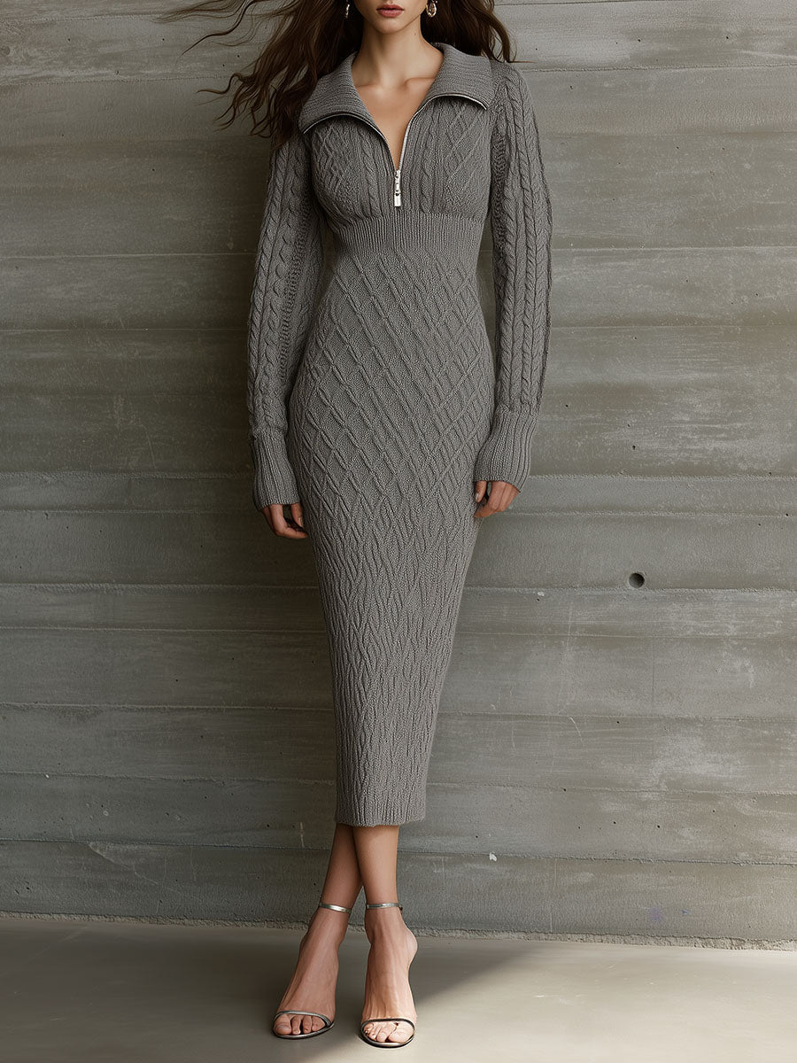 Chic Grey Half-Zip Collar Cable Knit Sweater Midi Dress