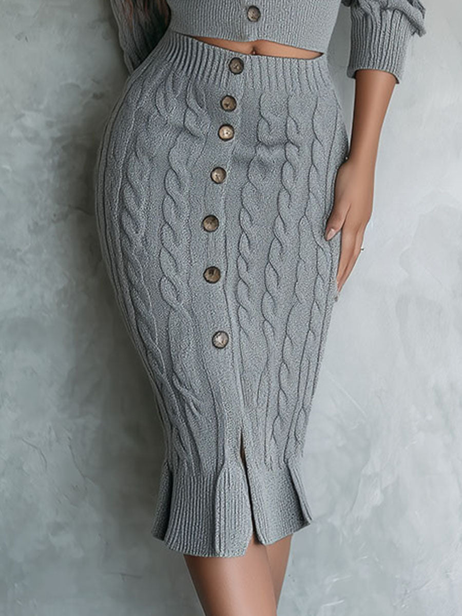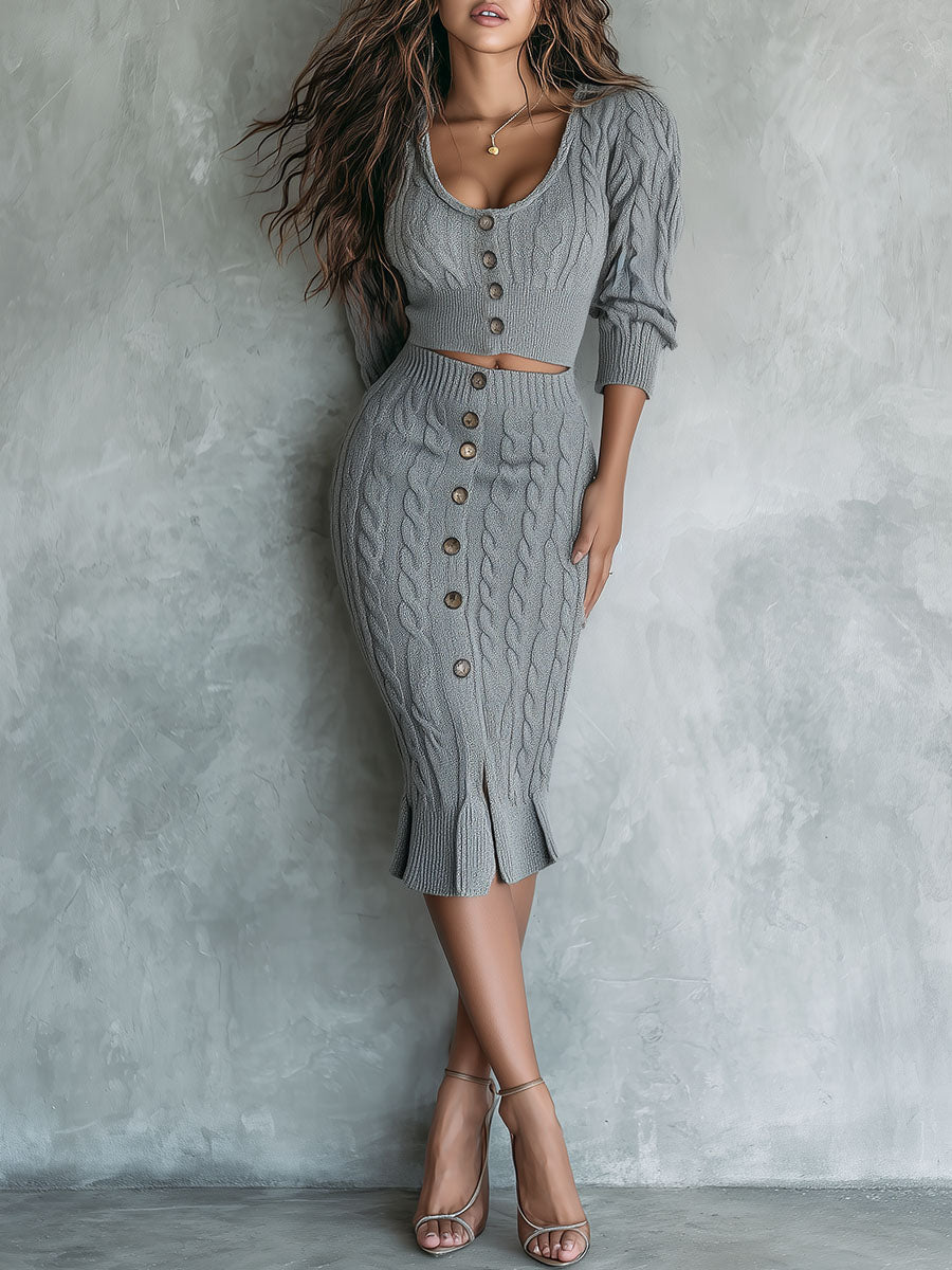 Chic Grey Knit Cropped Cardigan And High-Waist Midi Skirt Two-Piece Set
