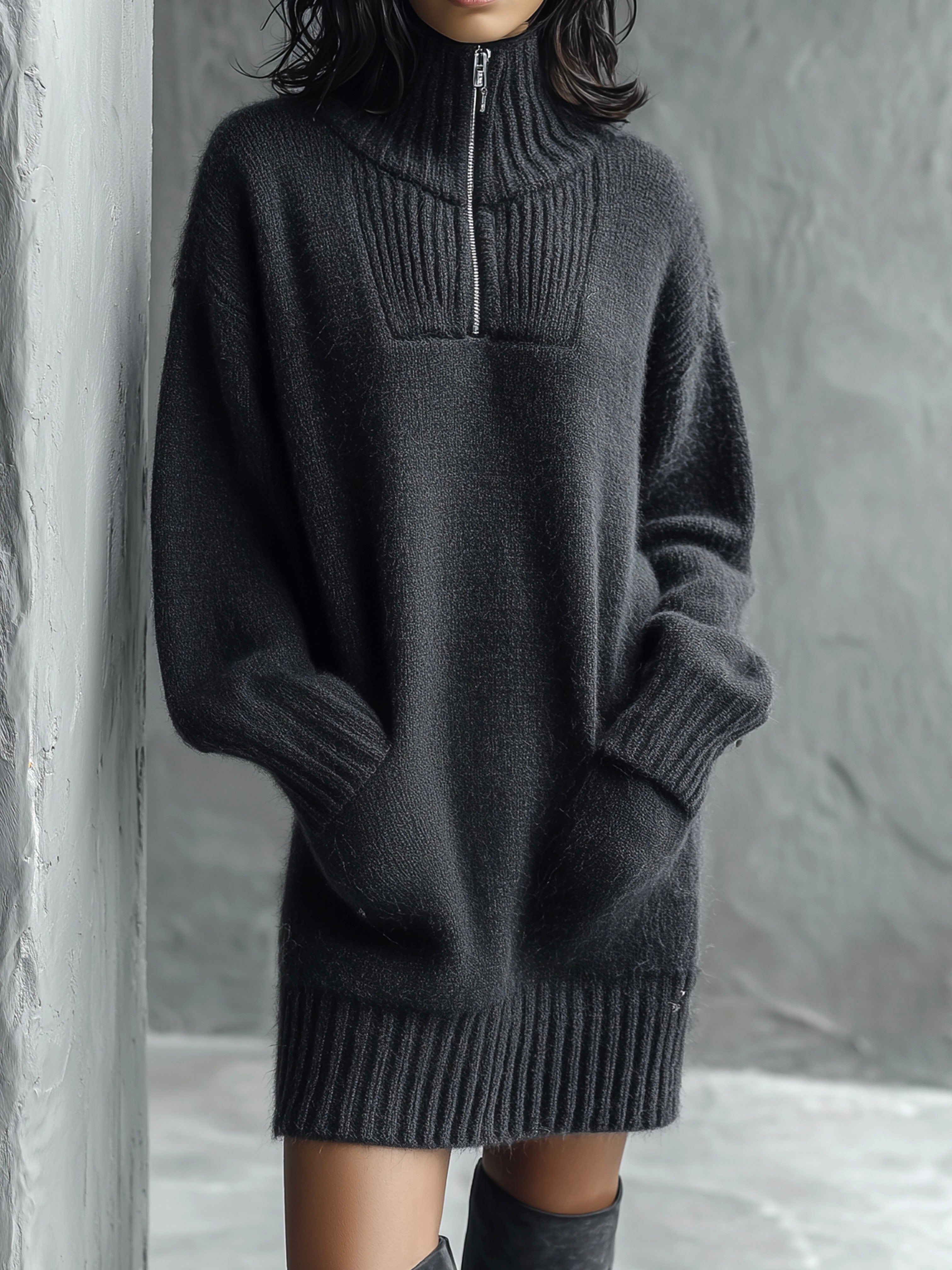 Chic Half-Zip High Neck Sweater Dress With Ribbed Trim