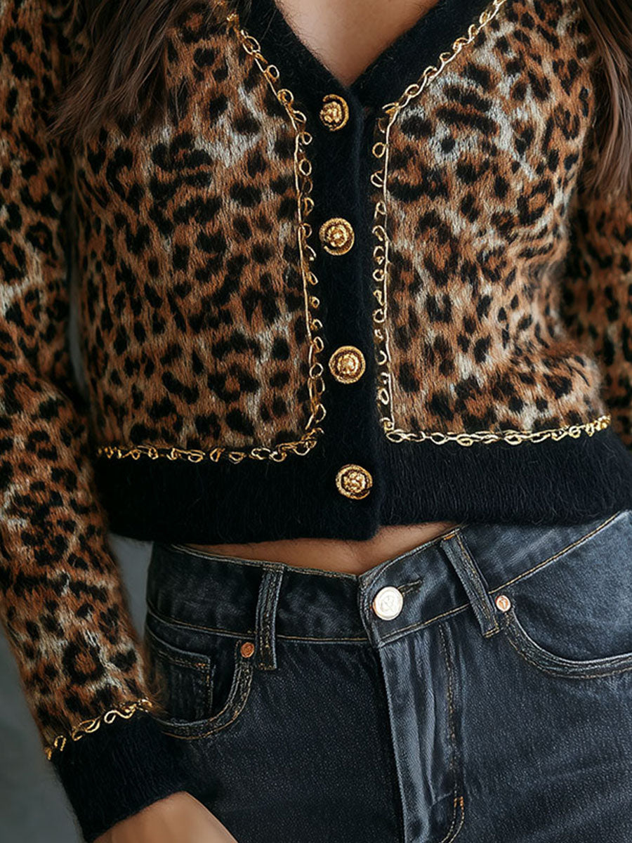 Chic Leopard Print Fuzzy Knit Cardigan With Gold Button