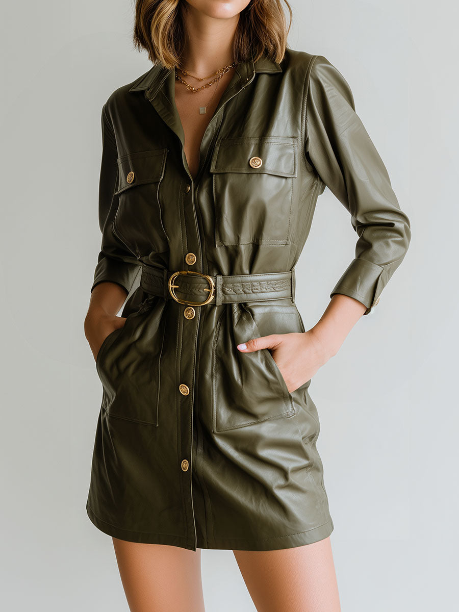 This chic olive green button-up shirt dress is crafted from eco-friendly leather, offering a sophisticated yet environmentally conscious choice for your wardrobe. The dress features a belted waist, providing a flattering silhouette that accentuates the figure. The rich olive green color adds a touch of elegance, making it perfect for both casual and semi-formal occasions.