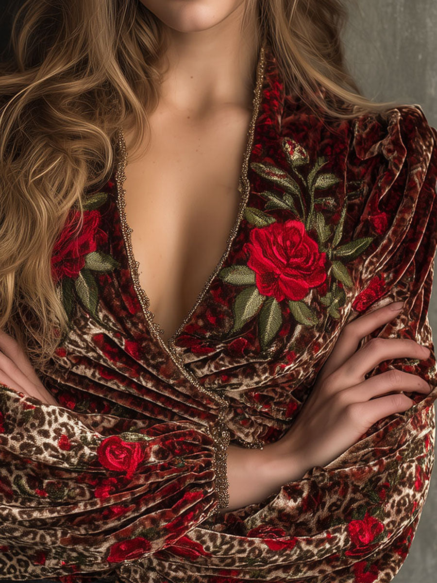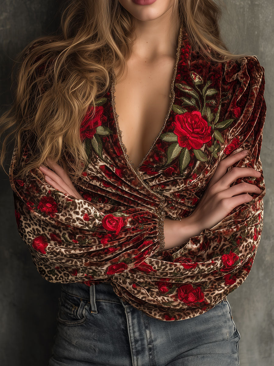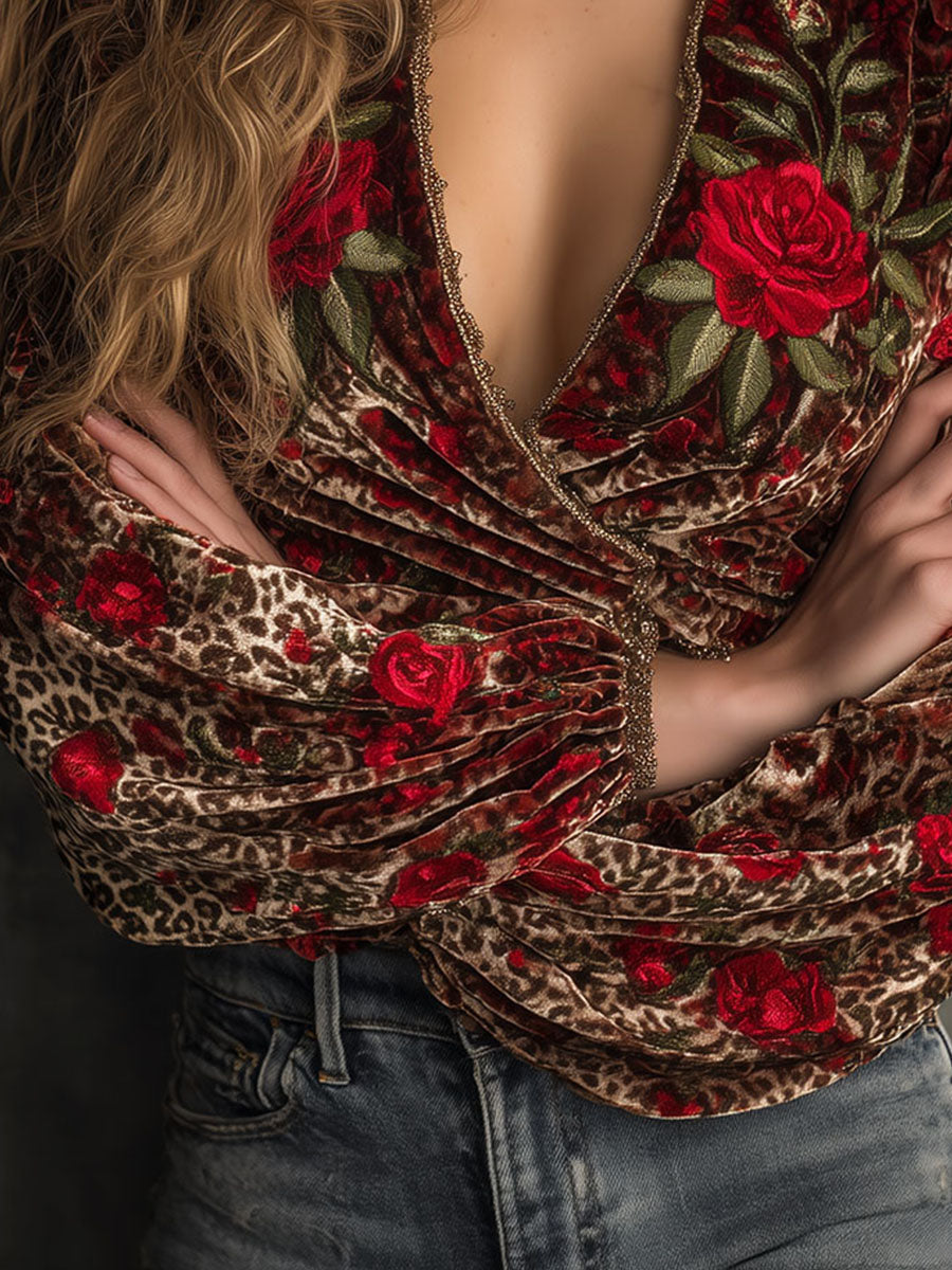 Chic V-Neck Rose Embroidery And Leopard Print Wrap Velvet Blouse