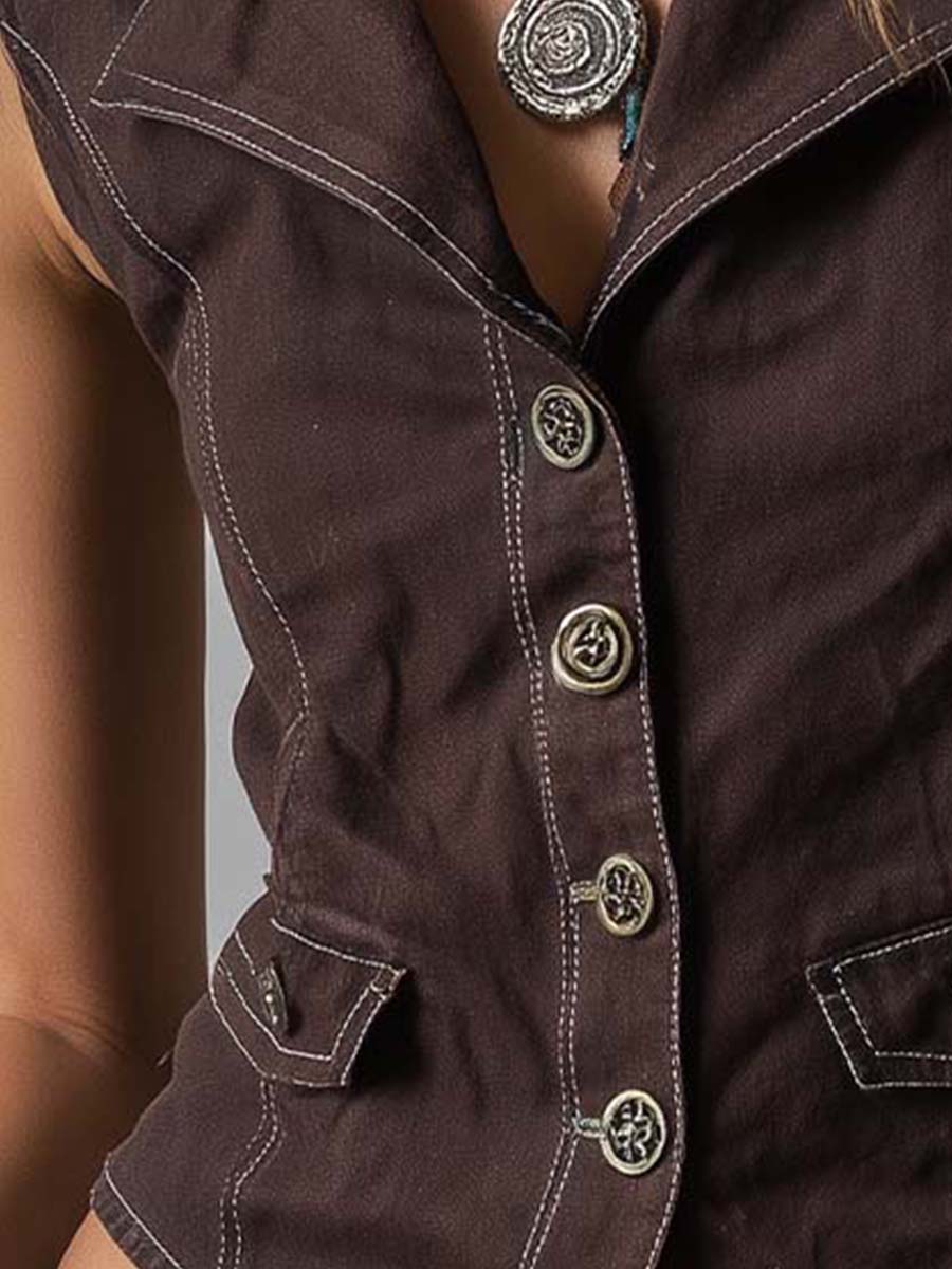 The Chocolate Contrast-Stitch Button Vest Top is a must-have for those who appreciate detailed craftsmanship and versatile fashion pieces. Its elegant design and adaptable nature make it a great choice for both professional and casual settings, providing a graceful and sophisticated look that is sure to impress.