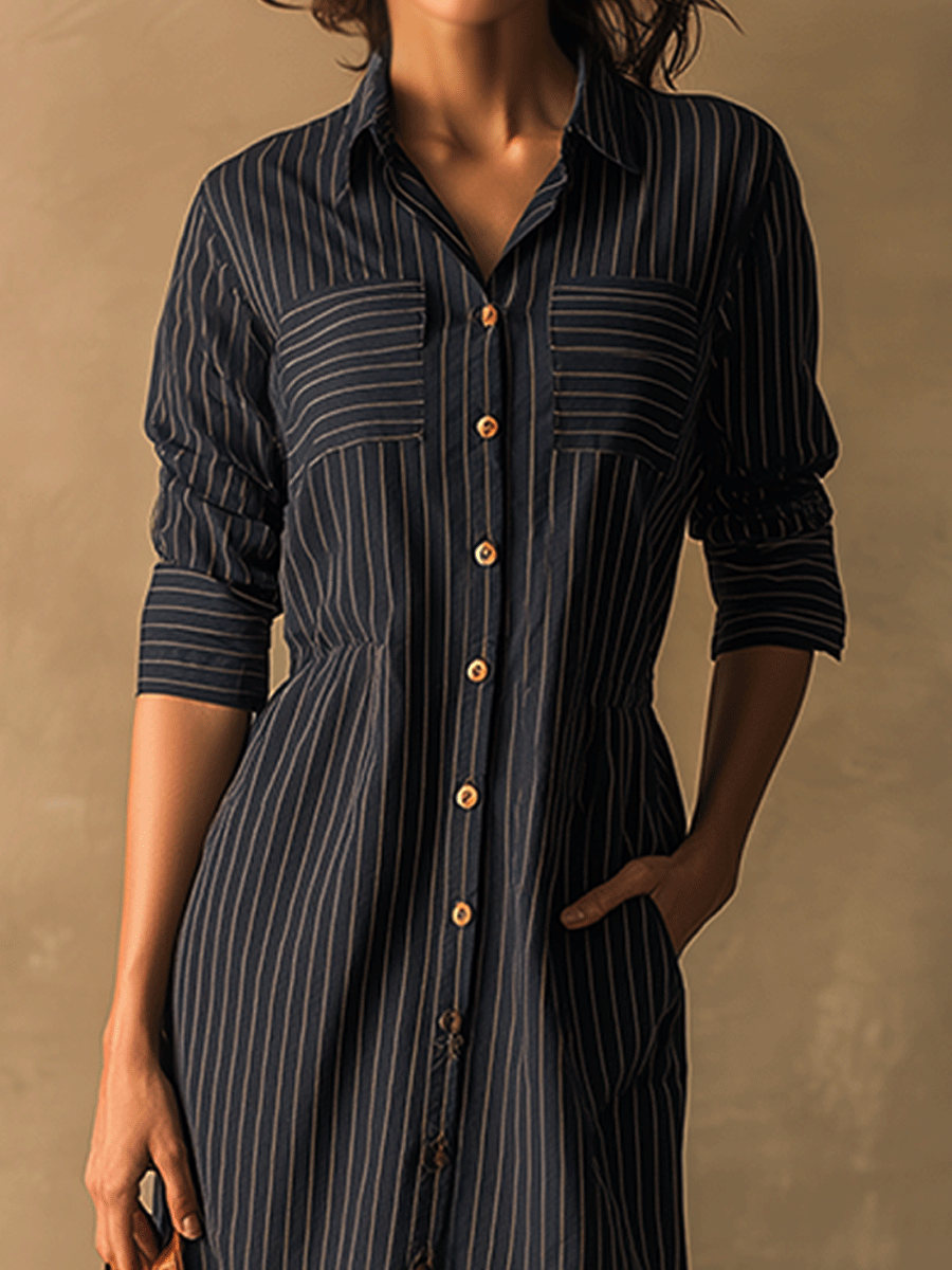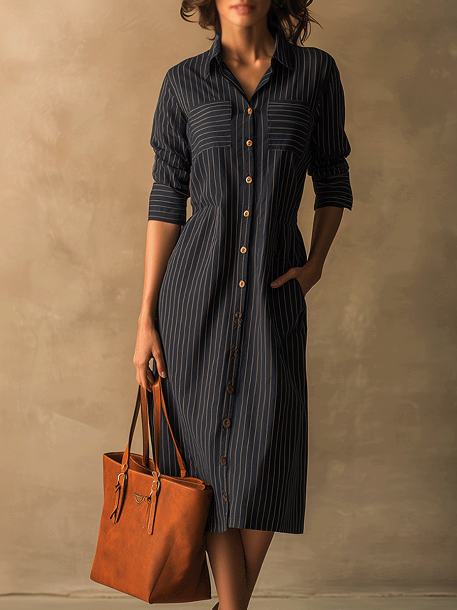 The Classic Lapel Button Fit Striped Midi Dress is an essential wardrobe staple that combines classic design with modern versatility. Its elegant features make it suitable for a range of occasions, ensuring you always step out in style.
