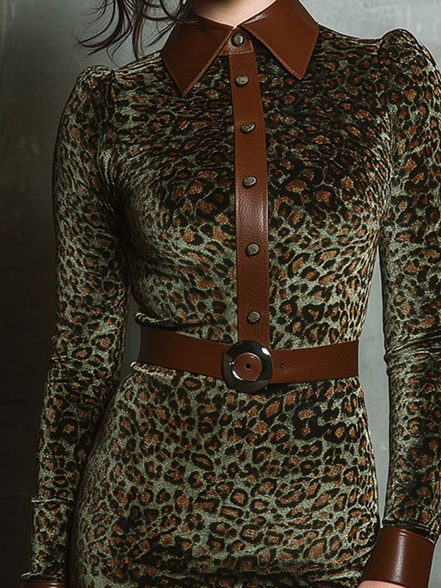 Classic Leopard Print Eco Leather Trim Velvet Mini Dress
