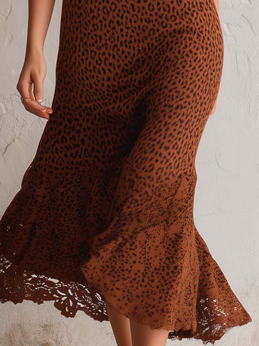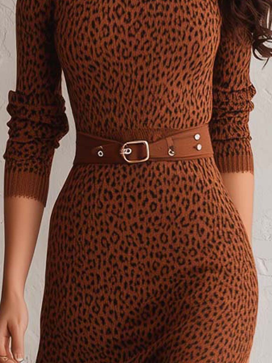 Classic Retro Belted Animal Print Sweater Midi Dress
