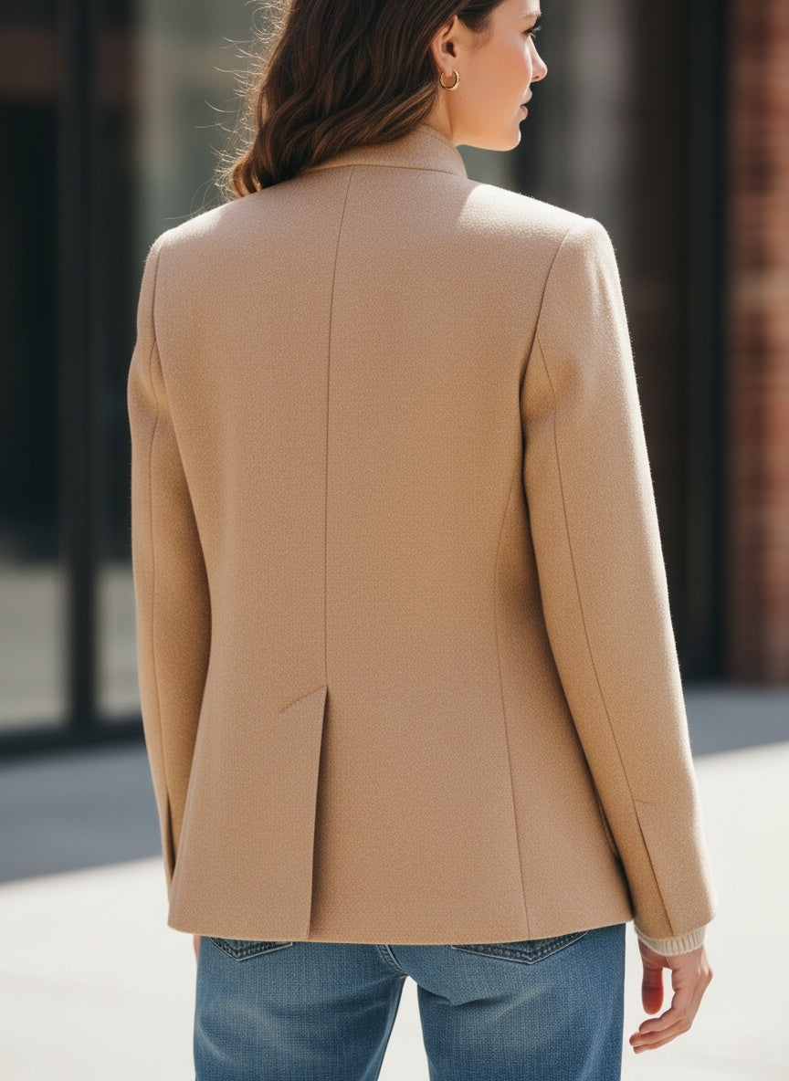 Layer this jacket over a cream-colored knit top and blue jeans for a smart casual ensemble, as shown. For a more professional look, pair it with tailored trousers and a silk blouse. It also complements a midi dress and ankle boots for a stylish autumn or spring outfit.