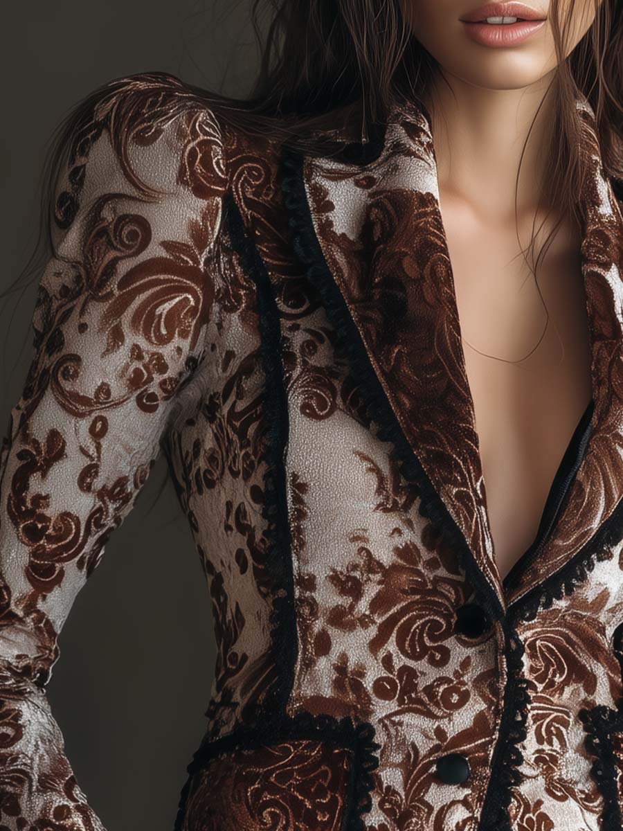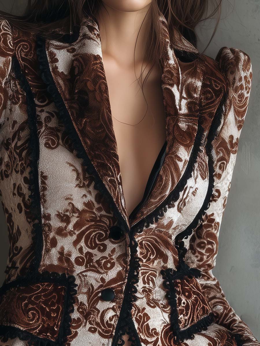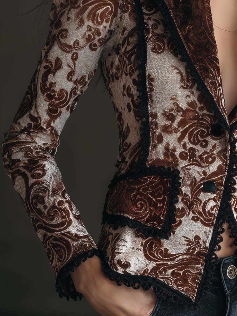 Inspired by the grandeur of Baroque artistry, this velvet blazer is a true expression of quiet opulence. Crafted from eco-friendly polyester velvet, it features a raised baroque floral print in a refined Cognac Brown and Ivory Dust palette. The tailored silhouette with sculpted shoulders and lace-trimmed edges captures both vintage romance and modern strength. Each detail—from the ornate pattern to the black crochet trim—reflects an elevated bohemian-luxury aesthetic.