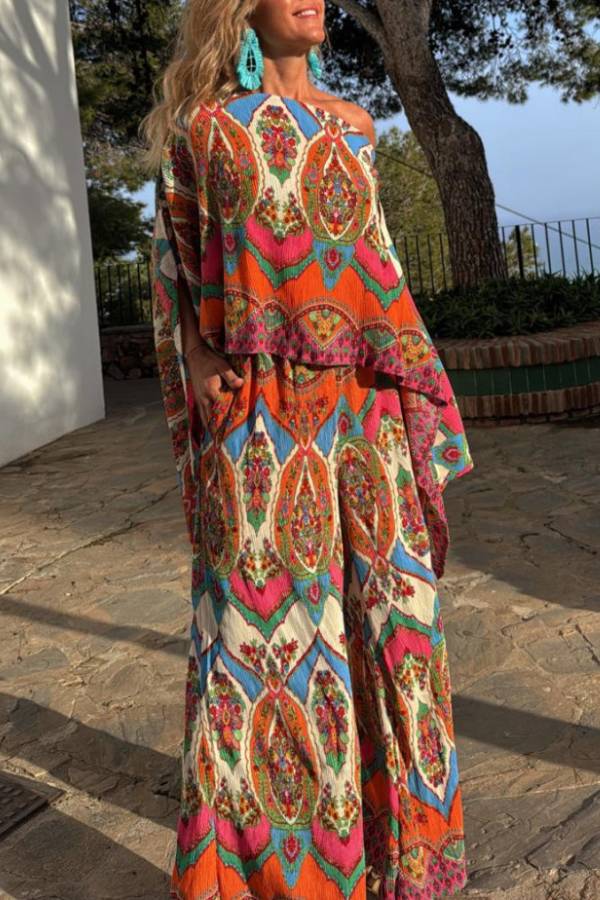 Colorful Day Unique Print Loose Cape and Elastic Waist Pocketed Pants Set
