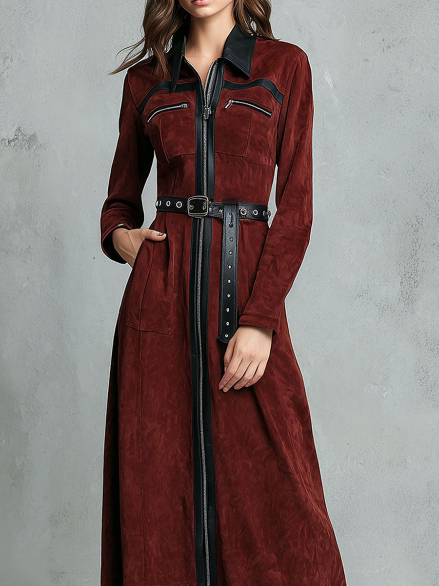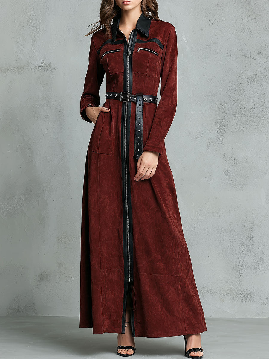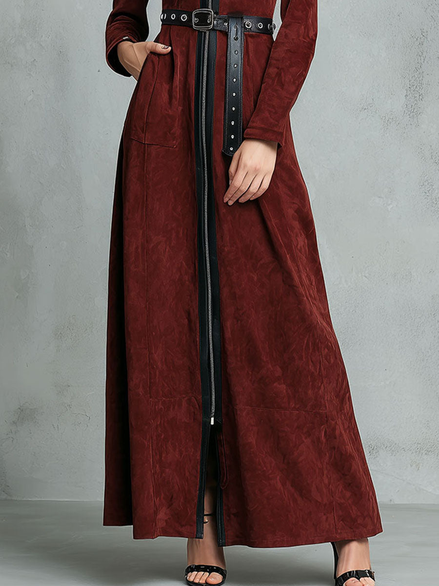 Contrast Trim Burgundy Eco Suede Maxi Dress With Zipper And Belt