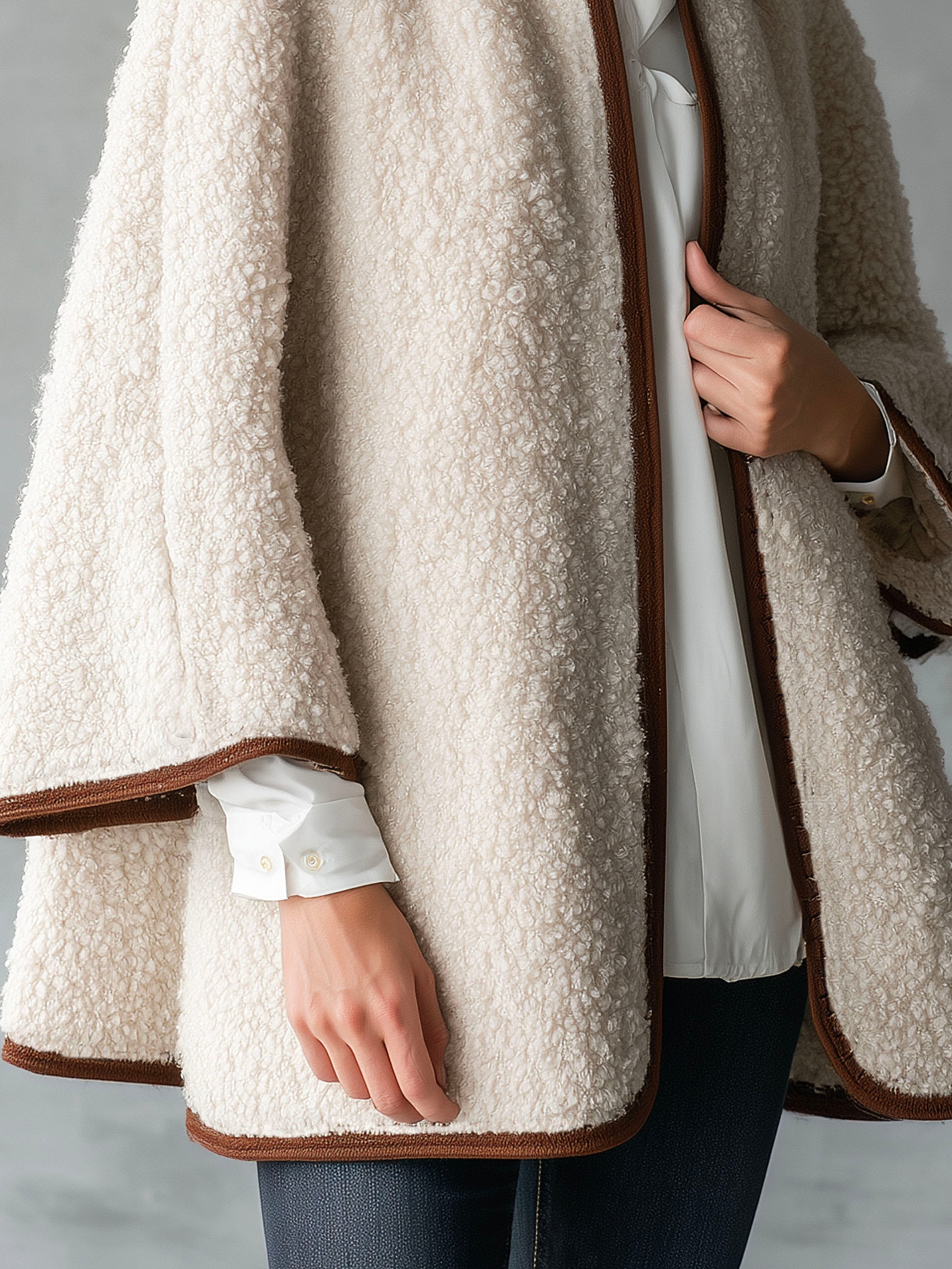 Cozy Ivory Teddy Shearling Cape With Contrast Trim