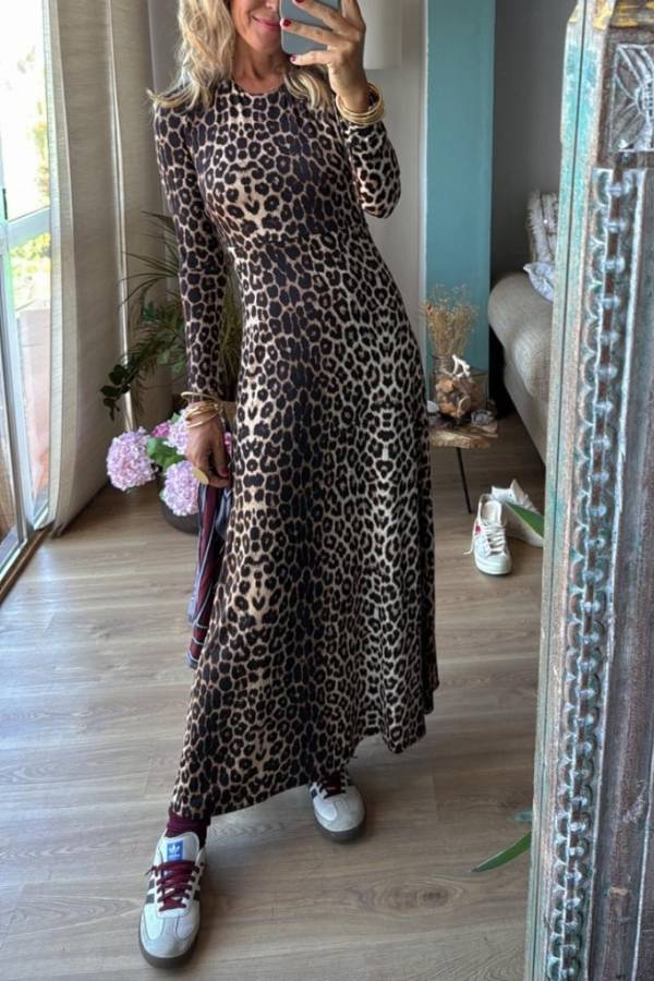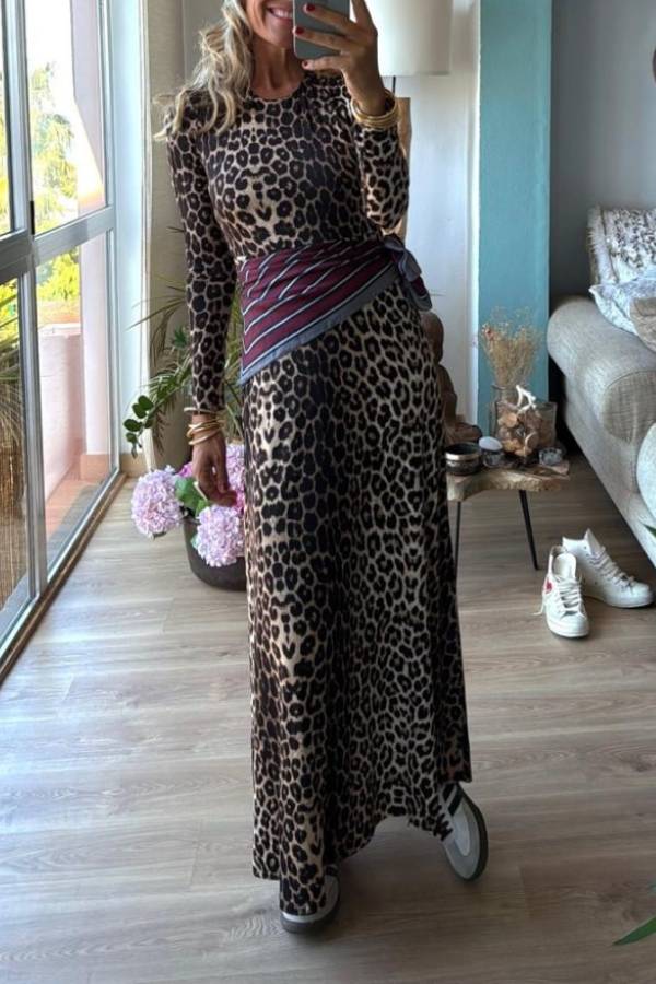 Long stretch dress with high waist cut, V-neck back, A-line skirt