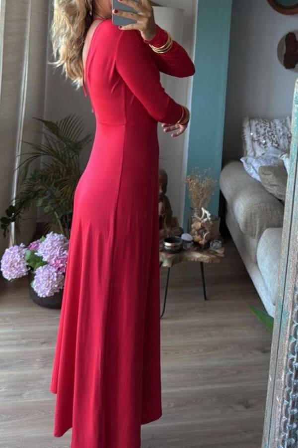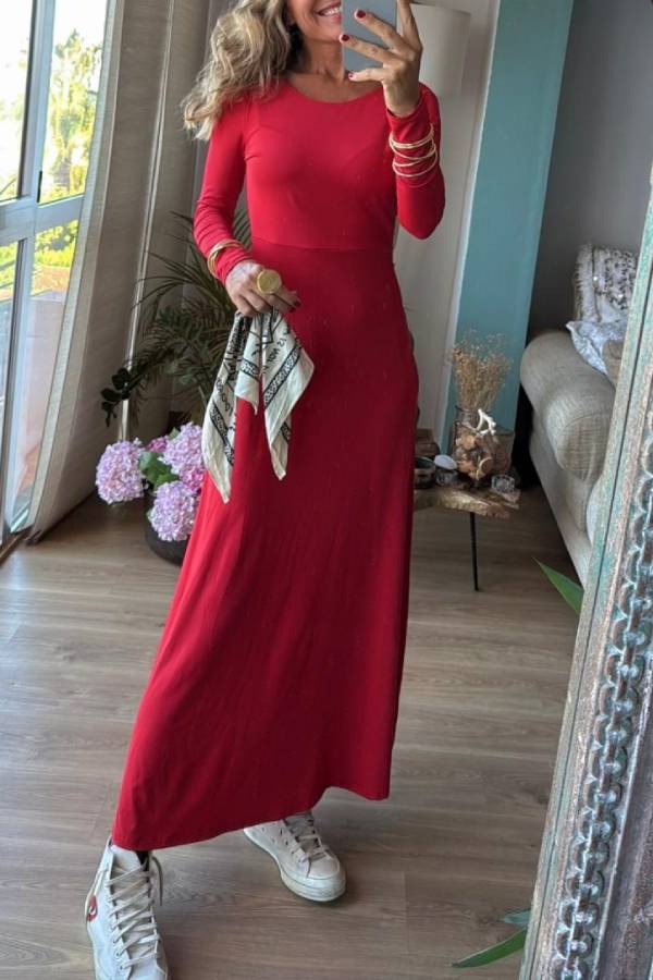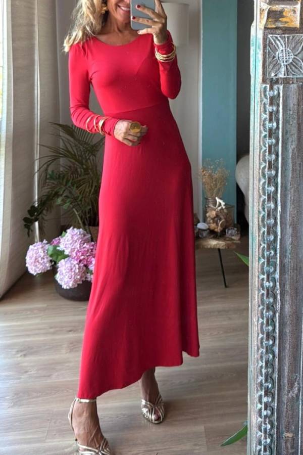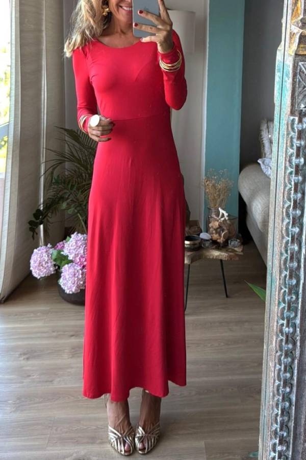 Long stretch dress with high waist cut, V-neck back, A-line skirt