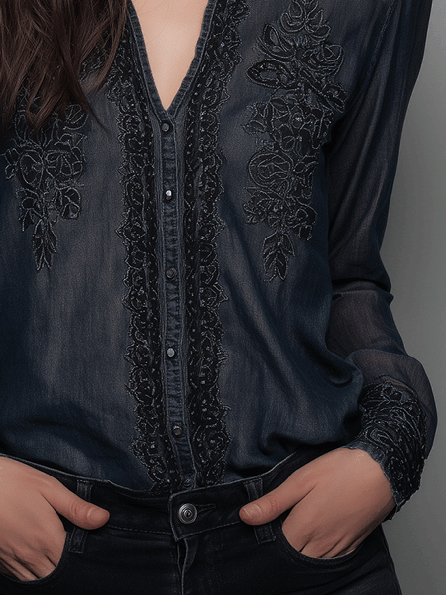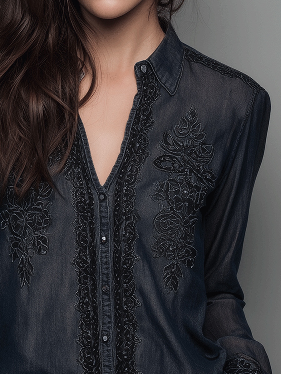 Elegant Dark Blue Chiffon Lace V-Neck Embroidered Shirt