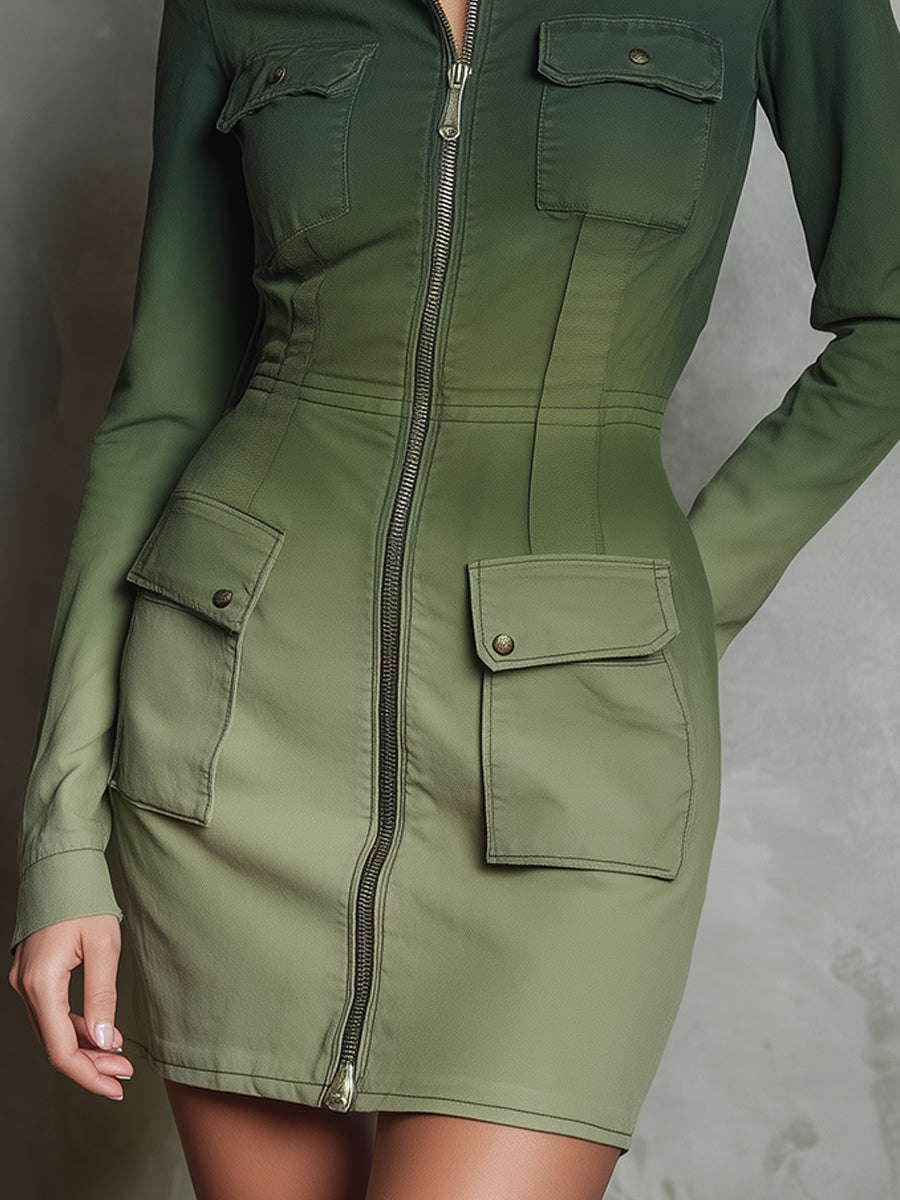 Elegant Denim Gradient Washed Flap Pocket Slim Mini Dress
