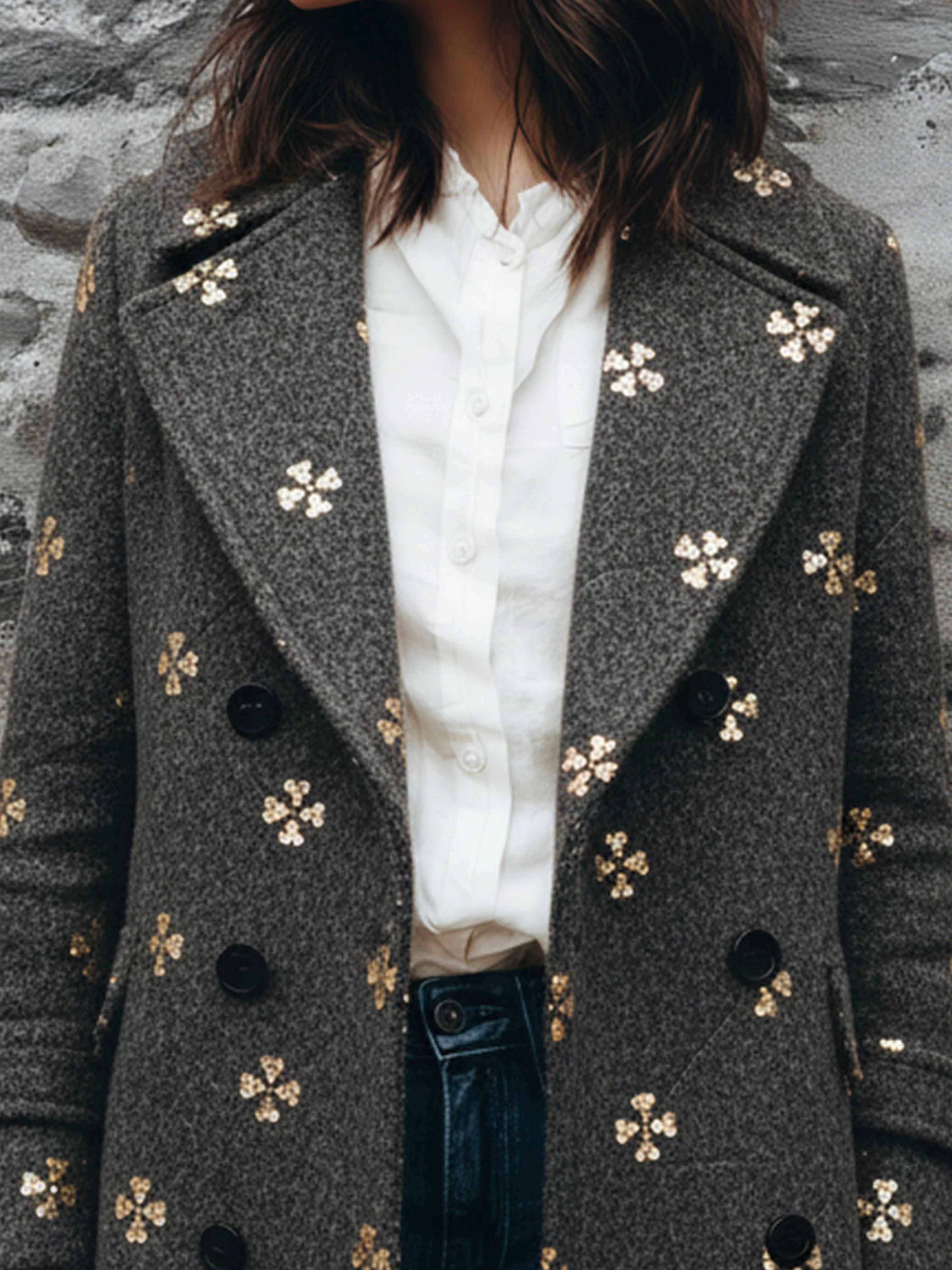 The Elegant Double-Breasted Charcoal Wool Blend Embellished Coat with Gold Sequin is an exquisite choice for those looking to merge elegance with a hint of sparkle. Its versatile design ensures it will become a go-to piece in any fashion-conscious individual's wardrobe, providing both warmth and style throughout the colder months.