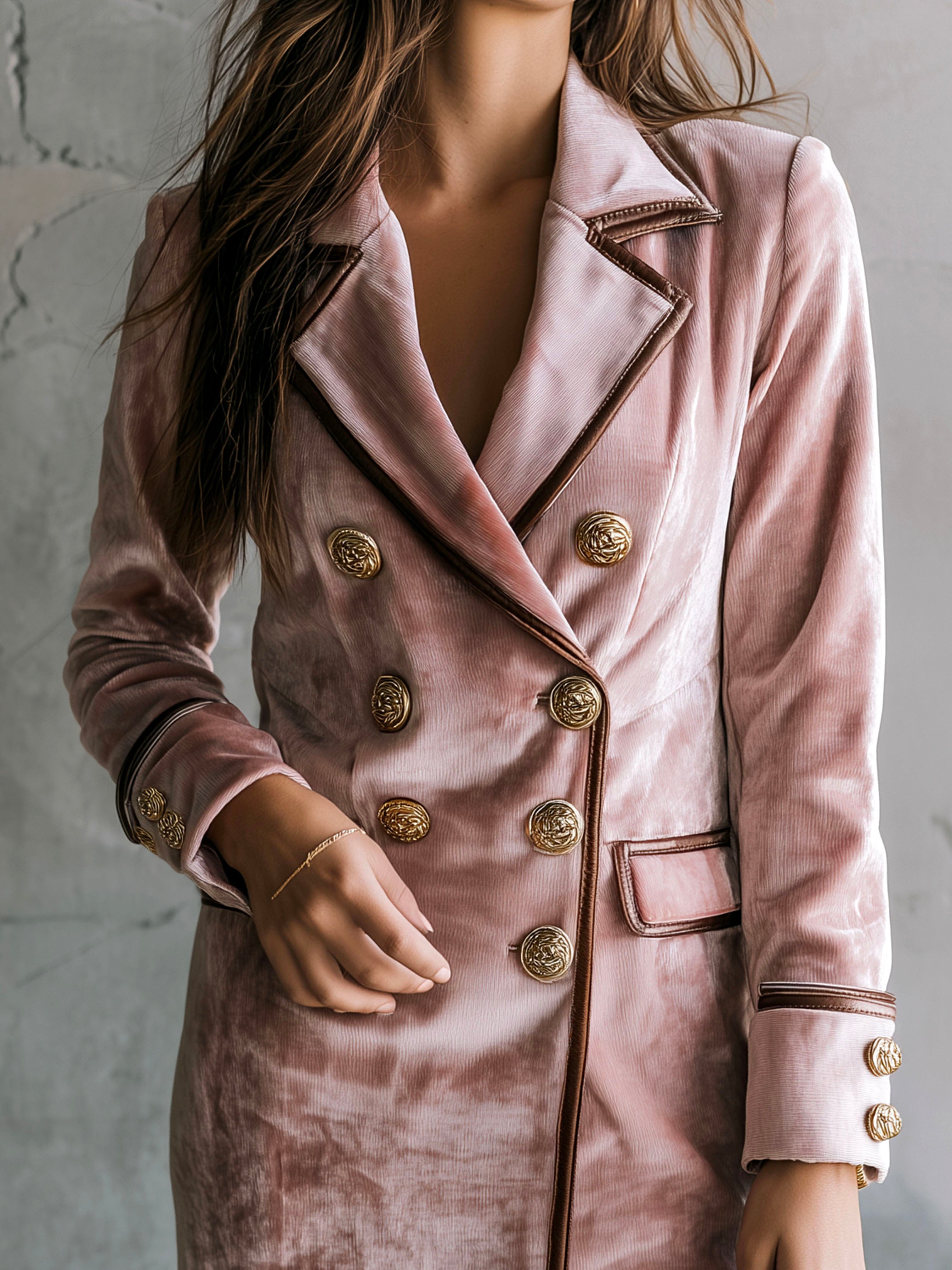 The Elegant Dusty Pink Double-Breasted Velvet Blazer Dress is a sophisticated piece that seamlessly blends classic tailoring with contemporary style. Crafted from sumptuous velvet, this dress offers a luxurious feel and a striking visual appeal. Its dusty pink hue adds a delicate touch of femininity, making it a versatile addition to any wardrobe.