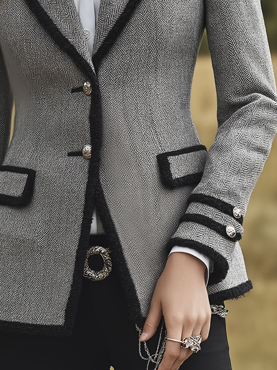 Elegant Herringbone Tweed Tailored Blazer With Contrast Trim