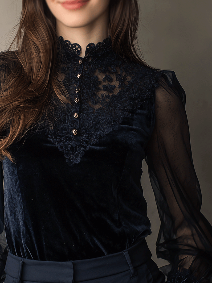 Elegant Navy Velvet Lace Panel Shirt