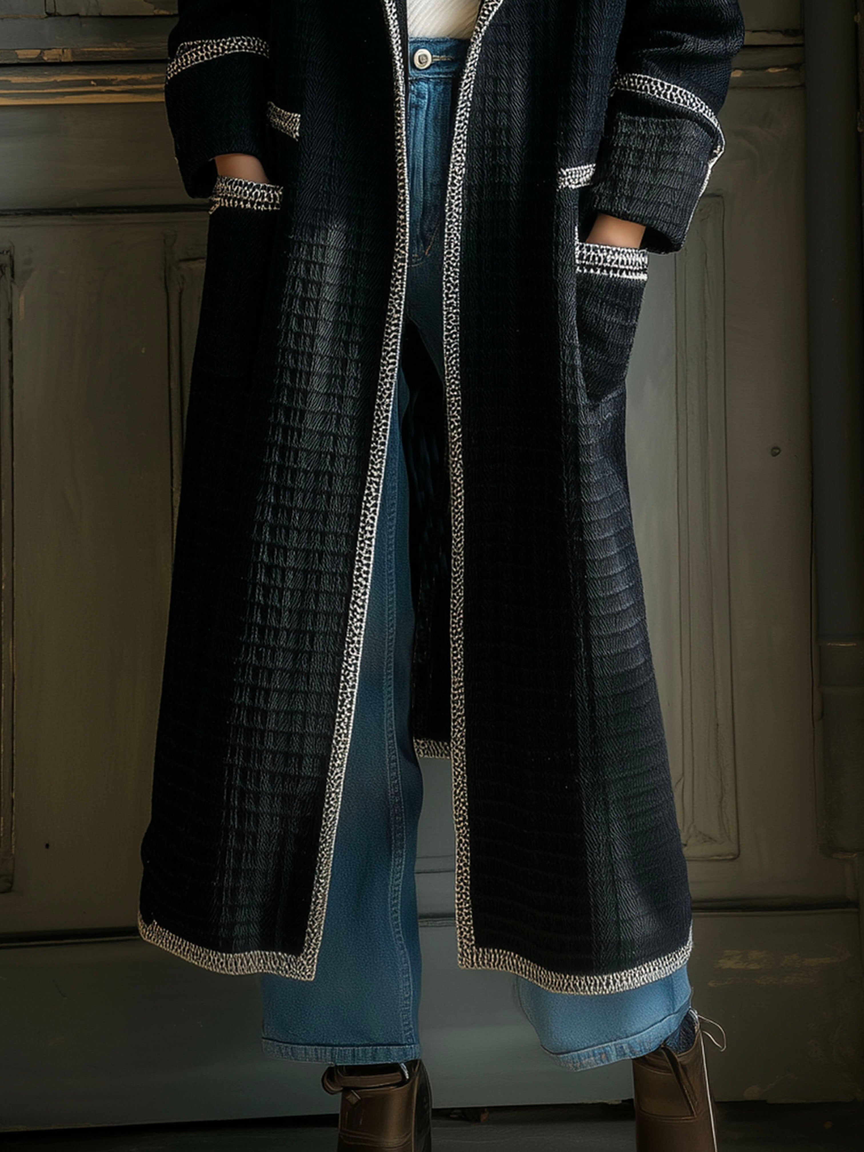 This Elegant Textured Quilted Contrast Trim Long Coat with Pockets is a must-have piece for any wardrobe. Its stylish design and practical features make it a versatile choice for various occasions, ensuring you stay both warm and fashionable during the colder months.