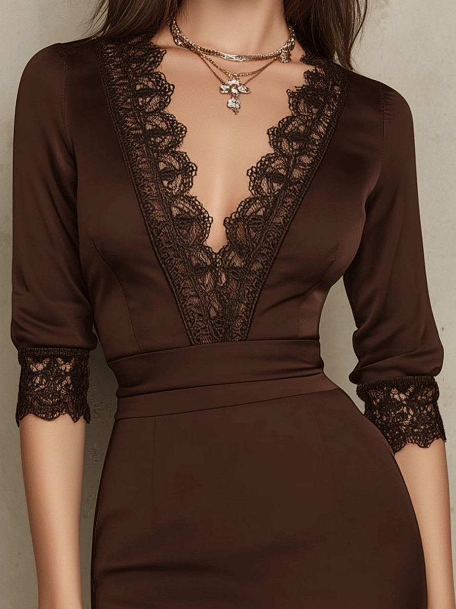 Elegant V-Neck Chocolate Lace-Trim Midi Bodycon Midi Dress | |