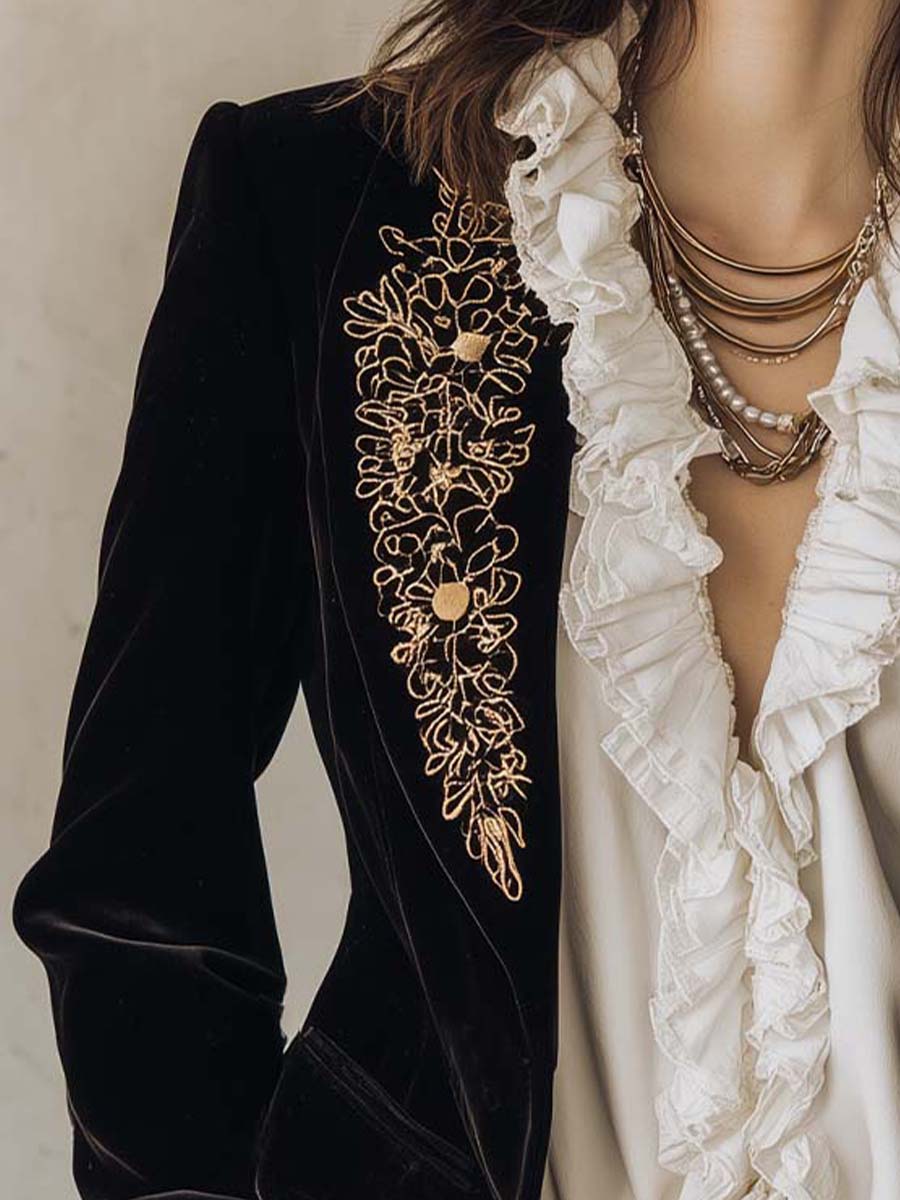 Embroidered Velvet Blazer With Gold Floral Detailing – Midnight Black