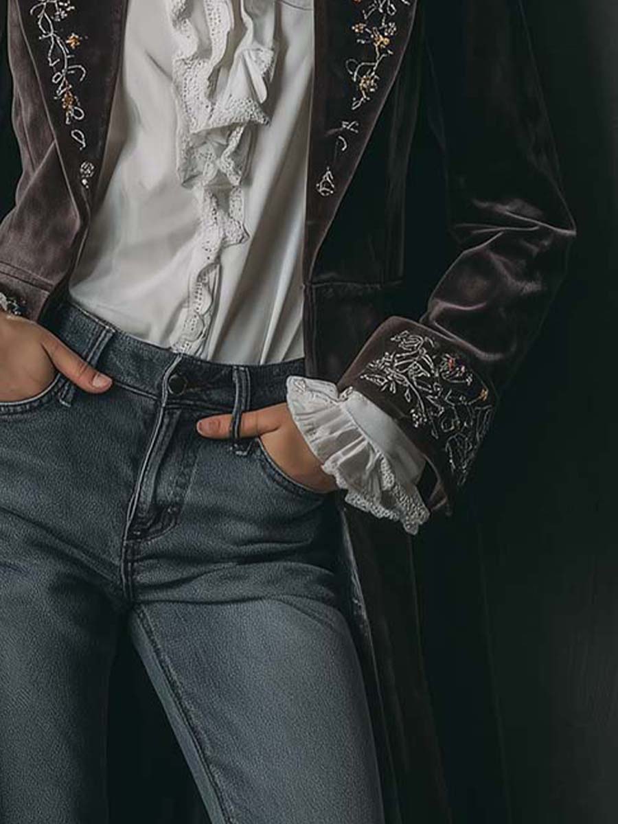 The embroidered cuffs and lapels add intricate detail, balancing romantic artistry with timeless sophistication.