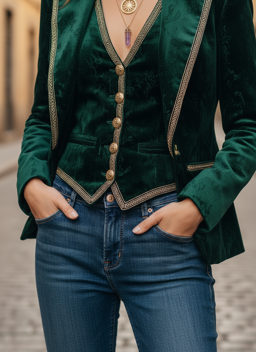 The Emerald Regal Velvet Trimmed Two-Piece Set is more than just an outfit; it's a statement of refined taste and timeless elegance. Its luxurious velvet and intricate gold detailing make it perfect for special events, business casual settings, or simply when you wish to exude sophisticated charm. Elevate your wardrobe with this exquisite set and embrace its unique blend of classic and contemporary style.