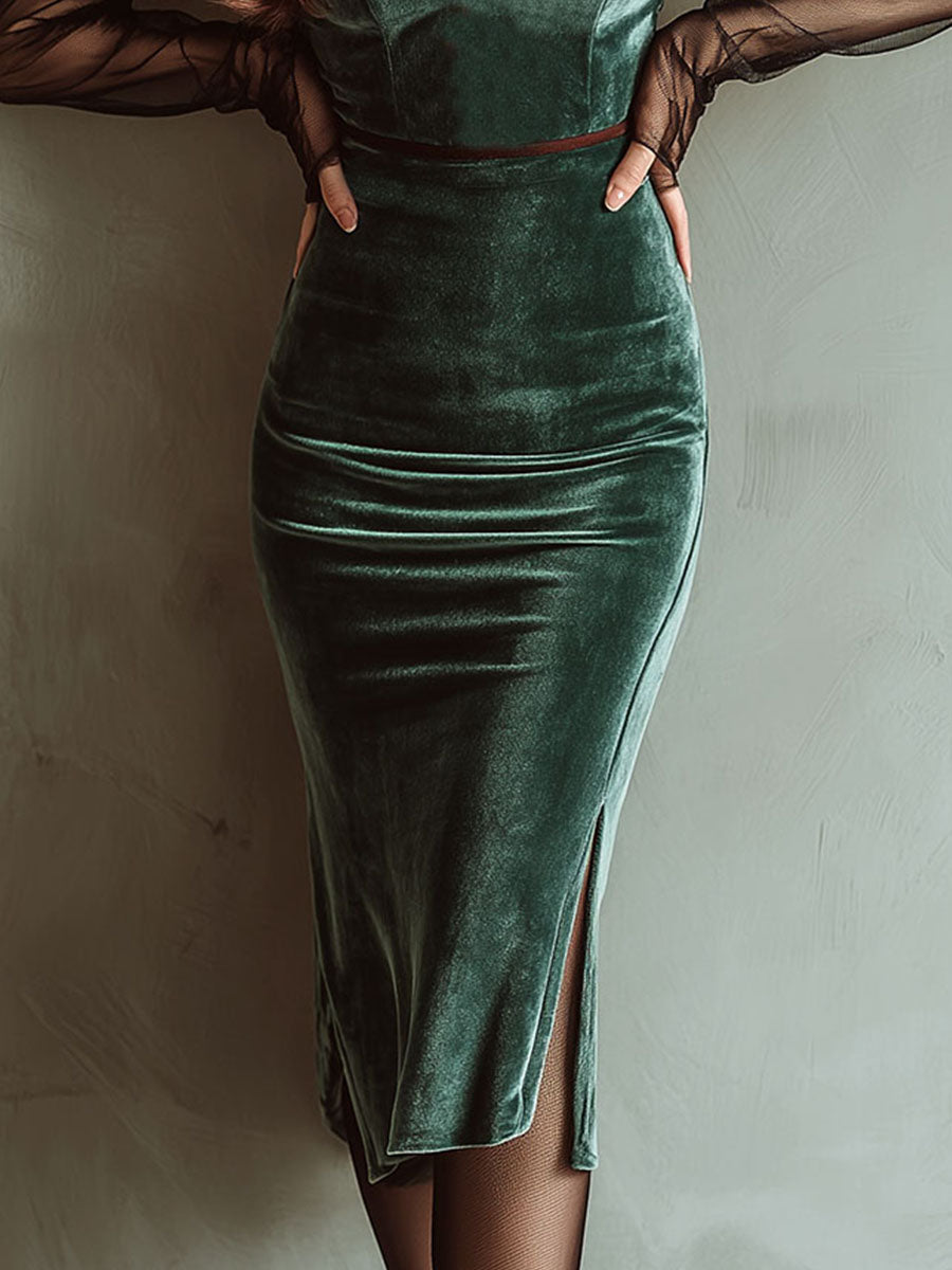 The Emerald Velvet Sheer Mesh Sleeves Bodycon Midi Dress with Side Slit is more than just a dress; it's an embodiment of style and grace. Its luxurious fabric, combined with modern design elements, makes it a must-have for anyone looking to dazzle at their next event. Don't miss out on adding this exquisite piece to your collection.