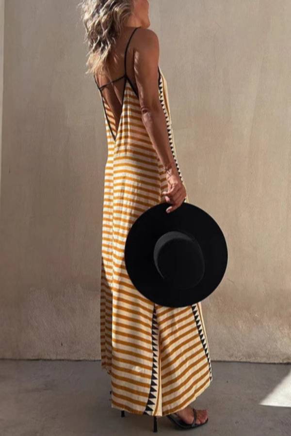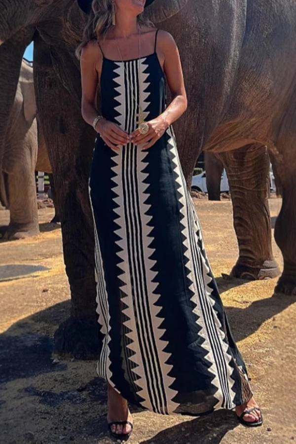 This strappy maxi dress is crafted from lightweight fabric and features a backless design with an ethnic-inspired geometric print. The fabric is breathable and skin-friendly, while the wide print enhances the vintage ethnic vibe. The backless detail adds a relaxed feel to the outfit. Suitable for vacations and casual outings, it can be paired with accessories to create a "casual and free + vintage and eye-catching" look, making it a versatile and stylish core piece.