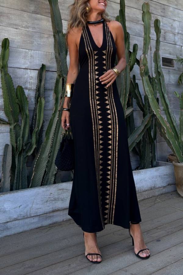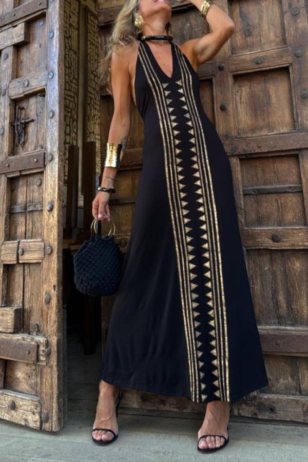Featuring a black base with gold ethnic-style geometric prints, this dress boasts a halter neck, deep V-neck, and open back design, with a long and loose cut. The halter neck design flatters the neck and shoulders, while the deep V-neck and open back enhance the sexy appeal. The geometric print incorporates bohemian elements, creating a look that is both visually distinctive and layered.
