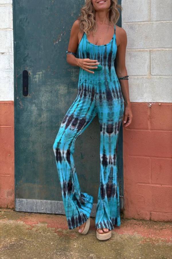 Exclusive Style Tie-dye Print Backless Tie-up Stretch Flared Jumpsuit