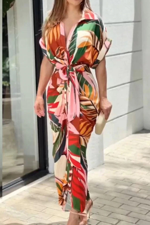 Flirt My Way Printed Belt Ruched Drape Shirt Midi Dress