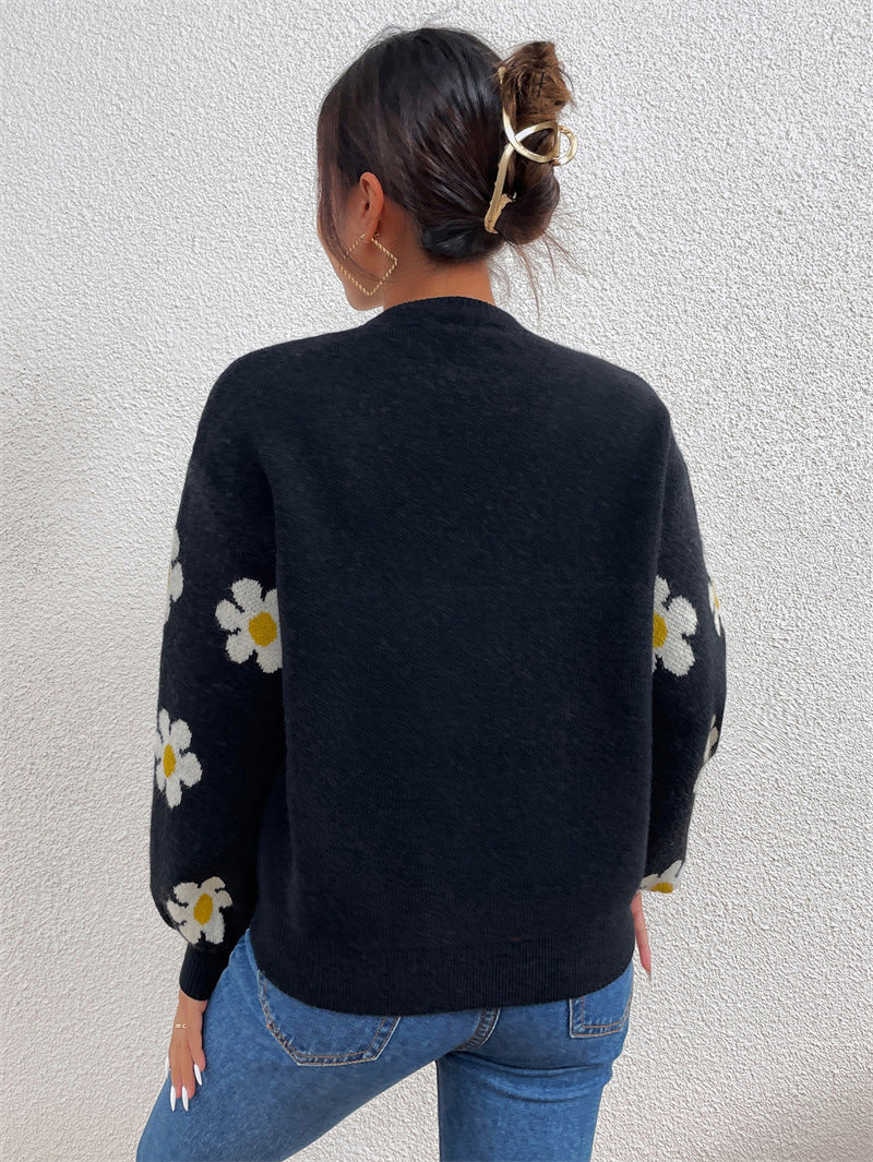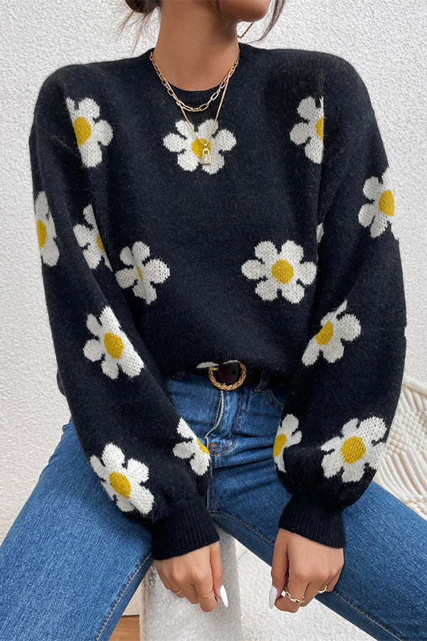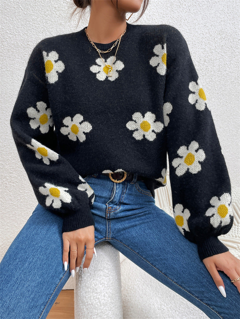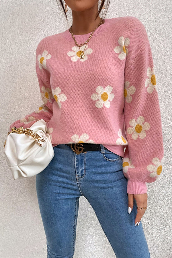 Floral Round Neck Jacquard Knitted Sweater Women's Top
