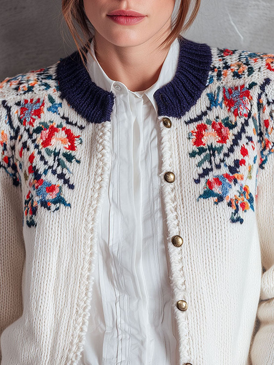 This Floral Yoke Embroidery White Knit Cardigan with Navy Collar is an essential addition to any wardrobe. Its refined details and cozy material make it perfect for both daytime wear and evening gatherings, providing both versatility and style.