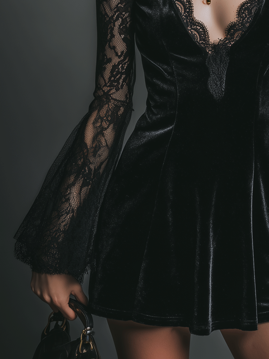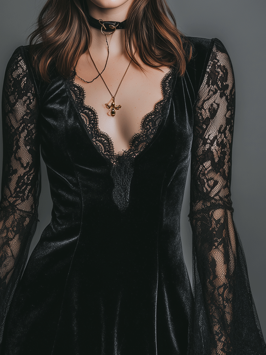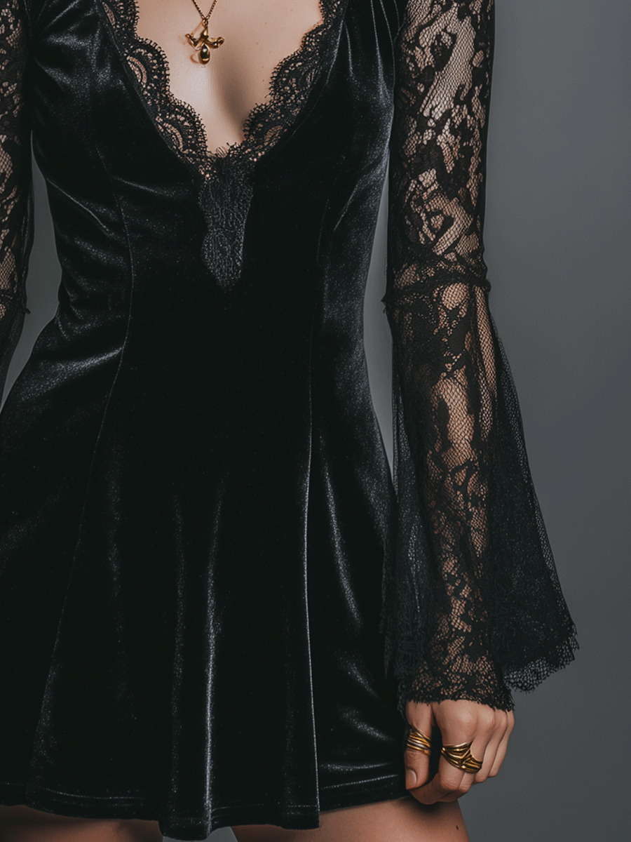 This Gothic Romance Velvet Noir Lace Mini Dress is the epitome of dark romantic style, ideal for those looking to make a bold fashion statement. Its blend of luxurious velvet and intricate lace captures a unique blend of mystery and elegance, making it an essential piece for any wardrobe.