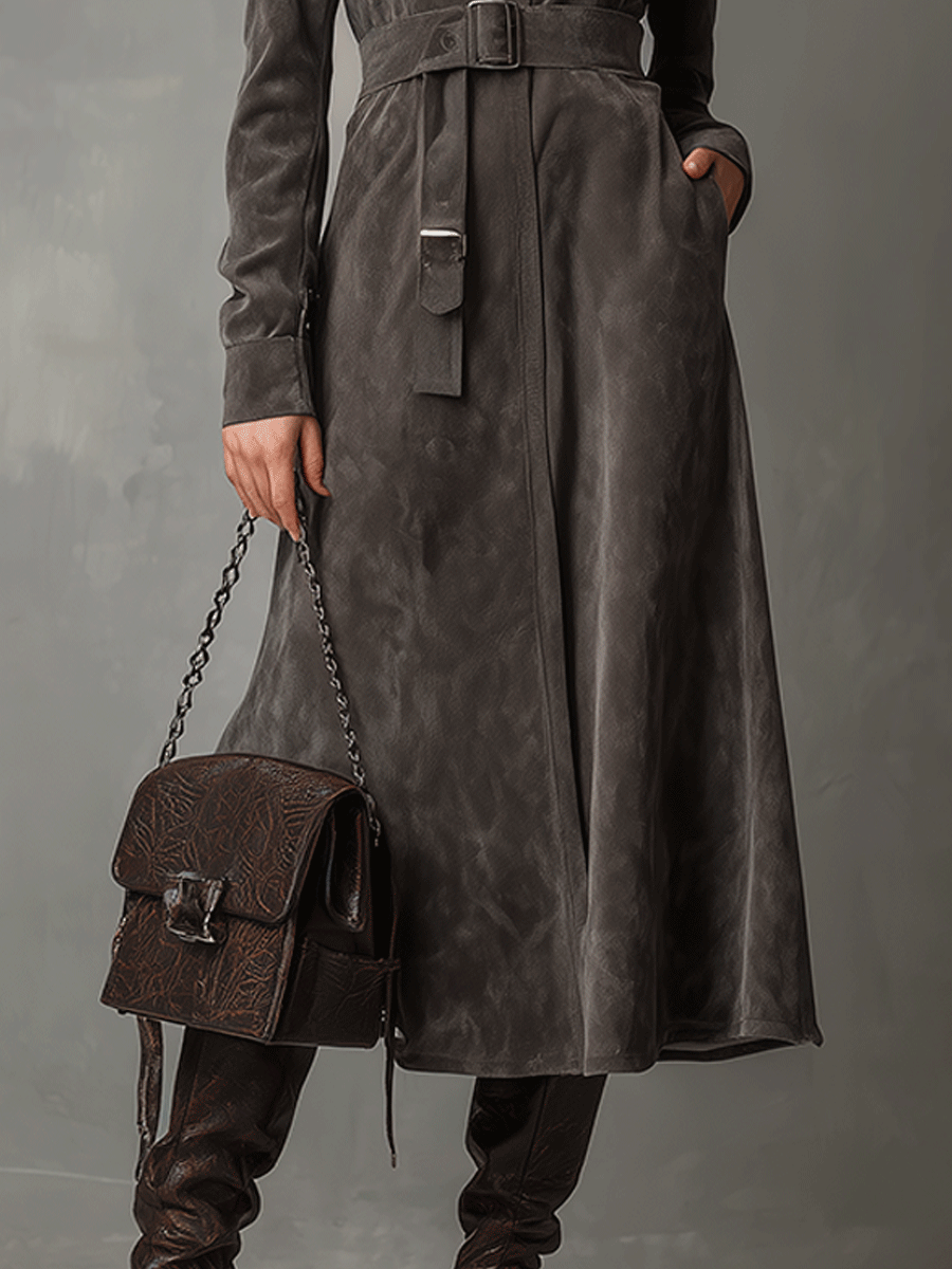High Neck Belted Suede Midi Dress