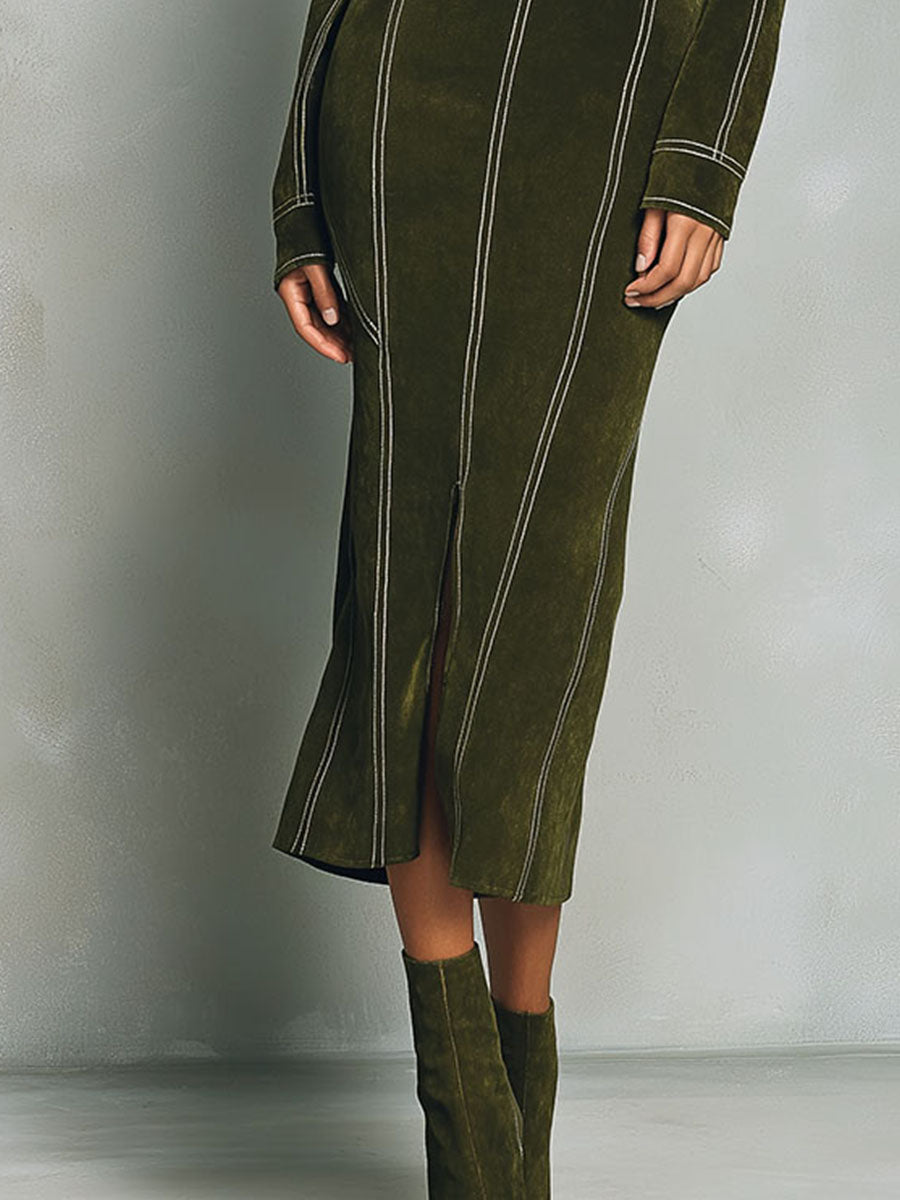 High Neck Zip-Up Olive Green Midi Dress With Contrast Stitching